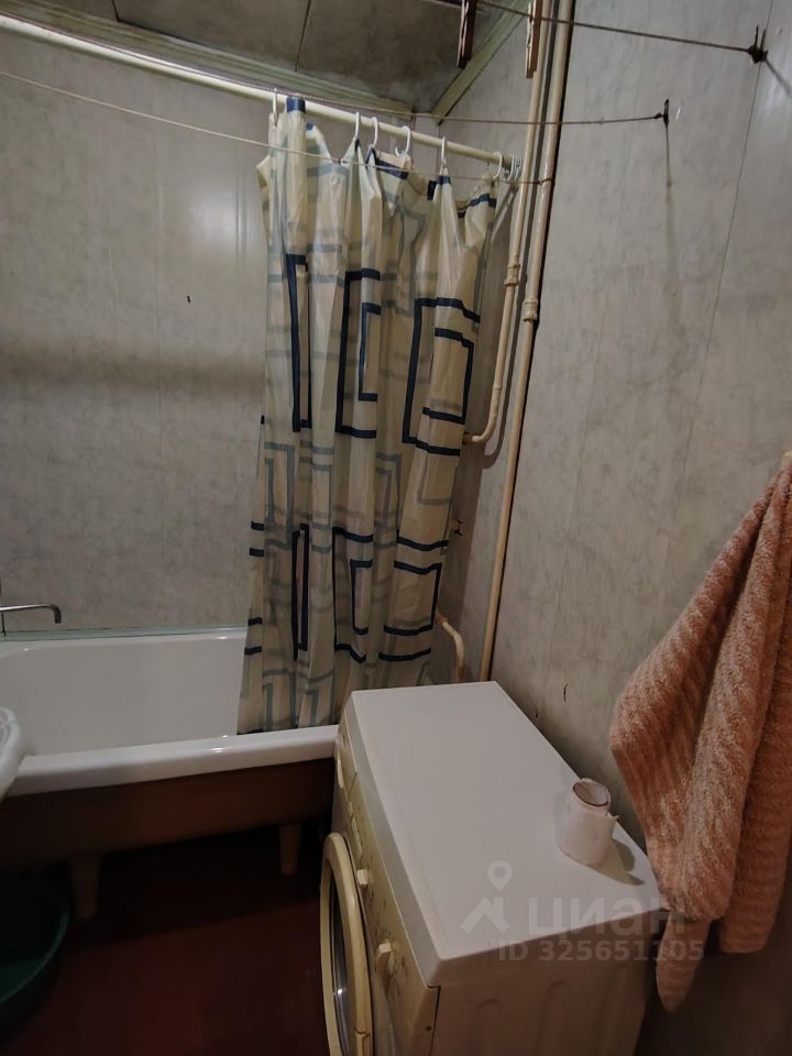 В комнате находится шкафы и телевизор, а так же раскладной диван. Санузел совмещенный, оборудован ванной и стиральной машиной.