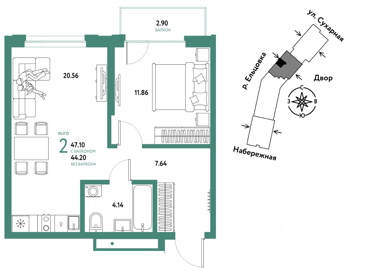 Продается 2комнатная квартира на 10 этаже от застройщика Страна Девелопмент. Площадь квартиры 47,1 кв. м.