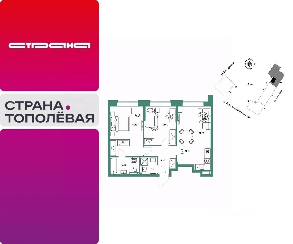 Продается 2комнатная квартира на 2 этаже от застройщика Страна Девелопмент. Площадь квартиры 67,73 кв. м.