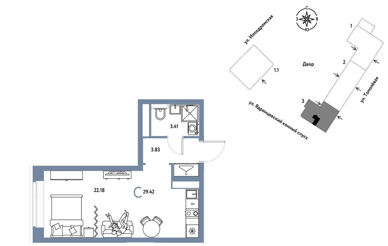 Продается 0комнатная квартира на 6 этаже от застройщика Страна Девелопмент. Площадь квартиры 29,42 кв. м.