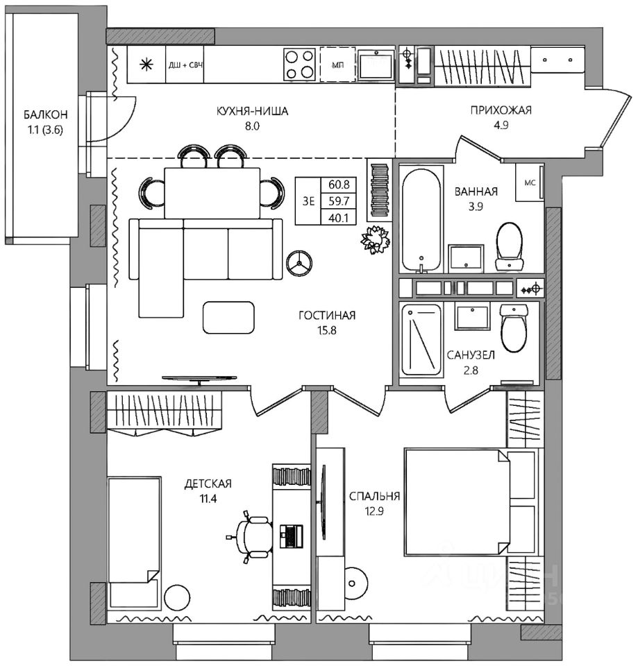 Общая площадь60,8 м2