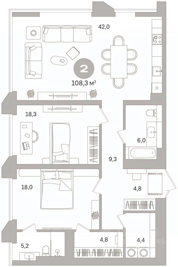 Квартира с кухней-гостиной и двумя спальнями в проекте Гоголя 21. Особенности планировки: свободная планировка. квартиры в нашей базе: ЗНГ01-Ж1.7.4.