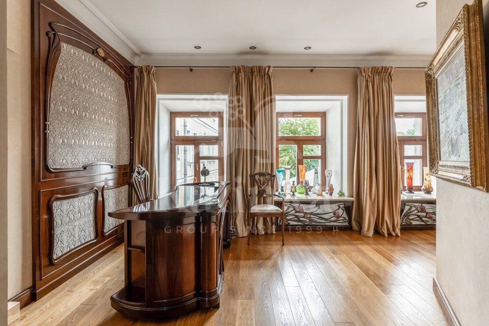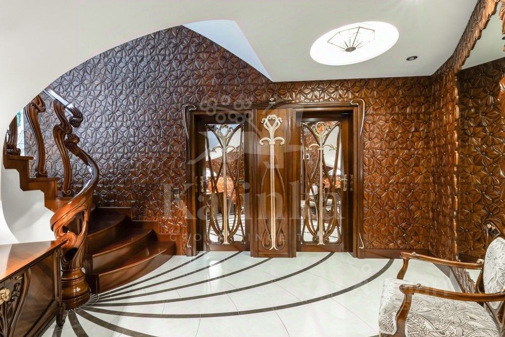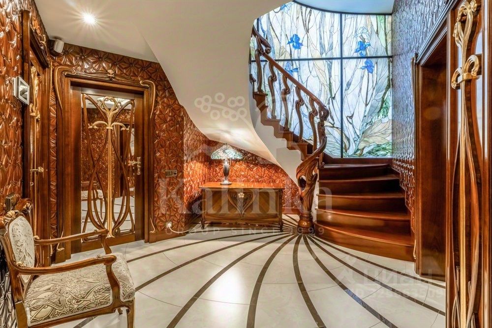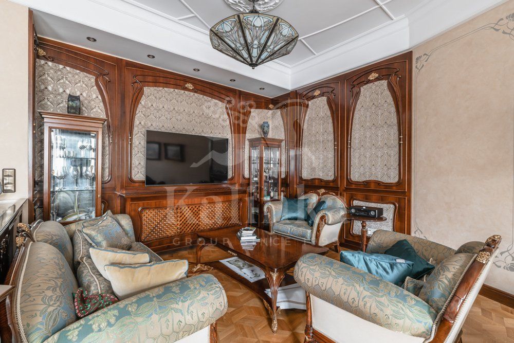 Отделка таунхауса выполнена в изысканном стиле ар-нуво с участием итальянских мастеров, использовавших премиальные материалы, привезенные из Франции и Италии. Интерьер украшают витражи и стеклянные изделия Tiffany, а в ванных комнатах — подлинные французские витражи XIX века. Мебель и порталы изготовлены на заказ в Италии по итальянским эскизам. В оформлении интерьера использована техника ''буазери'' — сочетание резного дерева и дорогих тканей, придающее пространству особую глубину и элегантность. Бытовая техника премиум-класса: на кухне встроенная техника Smeg, в остальных помещениях установлена техника Miele. Состояние ремонта — новый.