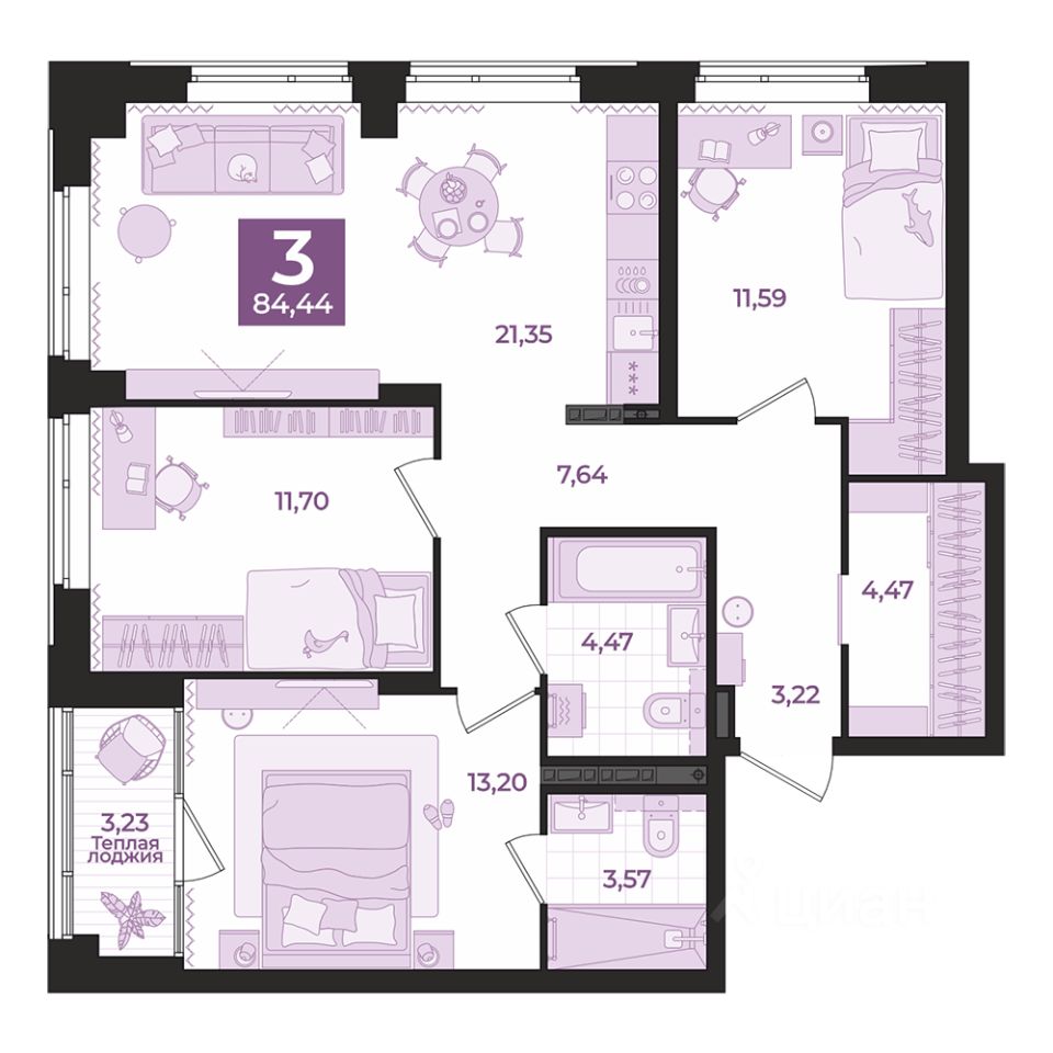 Общая площадь84,44 м2