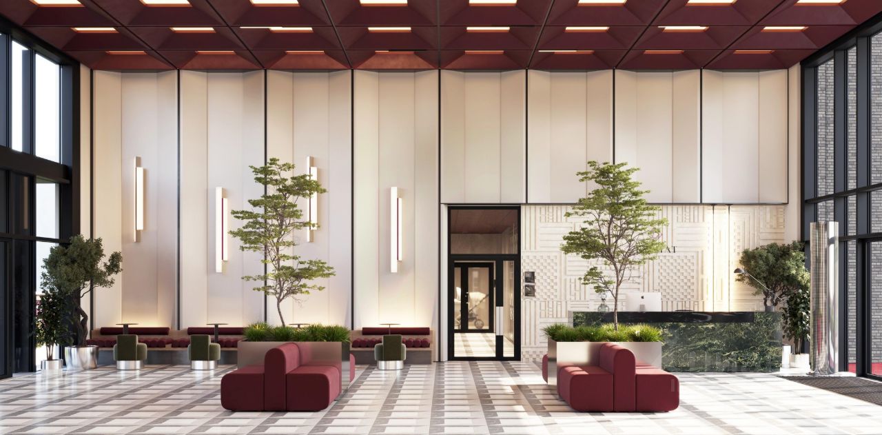 Двусветный холл связывает пространства внутреннего двора и улицы, является порталом в обособленный тихий двор жилого комплекса. Высокие витражи обеспечивают просматриваемость пространства, приглашая пройти внутрь.
