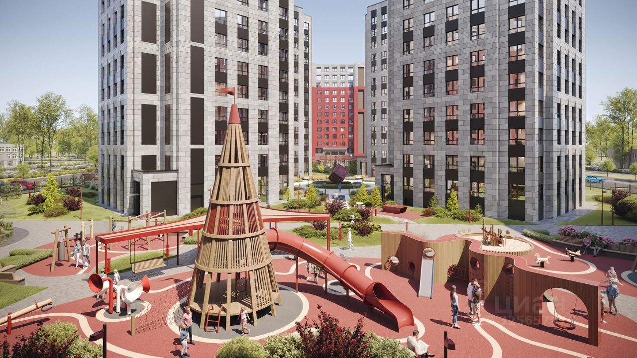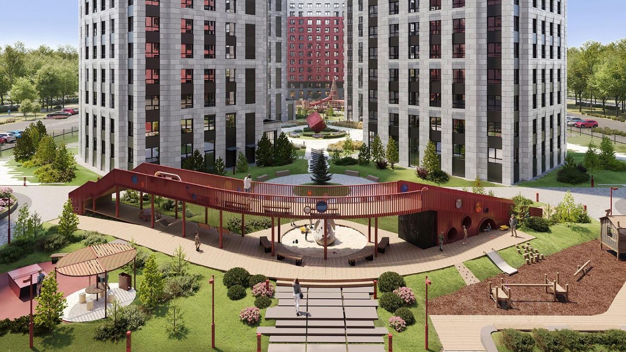 Концепция благоустройства делит пространство всего комплекса на три отдельных двора. Три двора соединены между собой визуально и с помощью шаговых дорожек, утопленных в рельеф. Деревья, кустарники, высокие газоны, рельеф со злаковыми растениями и прочими травами создают ощущение близости к природе.