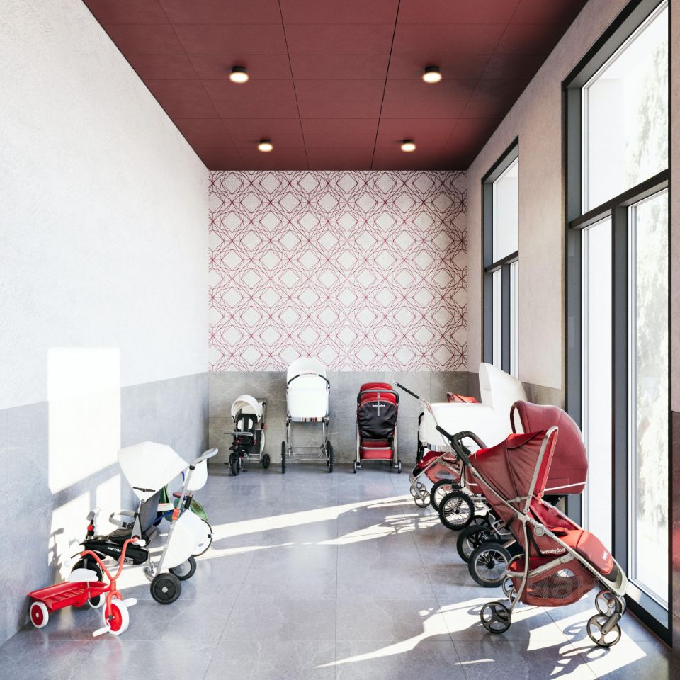 Двусветный холл связывает пространства внутреннего двора и улицы, является порталом в обособленный тихий двор жилого комплекса. Высокие витражи обеспечивают просматриваемость пространства, приглашая пройти внутрь.