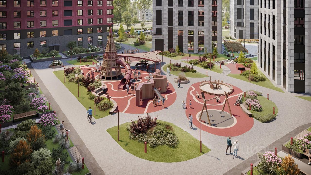 Концепция благоустройства делит пространство всего комплекса на три отдельных двора. Три двора соединены между собой визуально и с помощью шаговых дорожек, утопленных в рельеф. Деревья, кустарники, высокие газоны, рельеф со злаковыми растениями и прочими травами создают ощущение близости к природе.