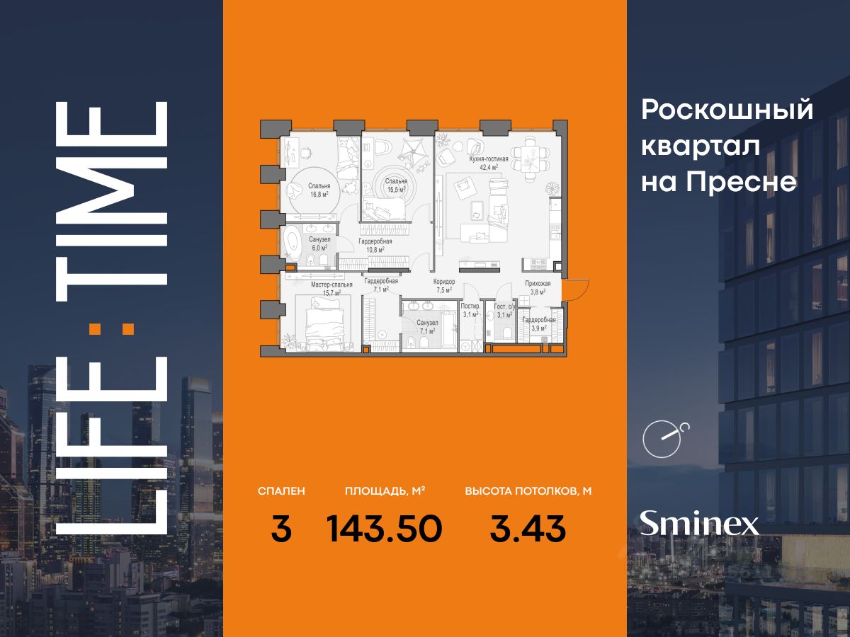 Просторная светлая квартира площадью 143,5 кв. м. Кухня-гостиная (42,3 кв. м) с окнами, выходящими на запад, в тихий приватный двор-парк с ландшафтным дизайном и на открытую панораму города, гостиницу Radisson и Москва-Сити. Большое панорамное окно в с/у с возможностью открывания настежь улучшает видовые характеристики. Продуманная планировка позволяет разместить две мастер-спальни с отдельными санузлами и гардеробными и одной просторной спальней.