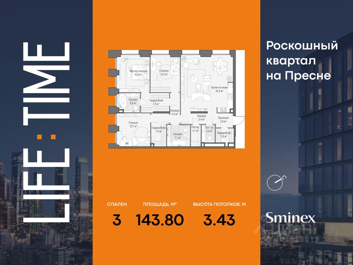 Life Time - роскошный современный квартал на Пресне, в наиболее быстро растущем премиальном районе ЦАО. Его насыщенная инфраструктура и выгодное расположение дарят время для жизни. Вы больше не тратите его на дорогу или ожидание, при этом ни в чём себе не отказывая.