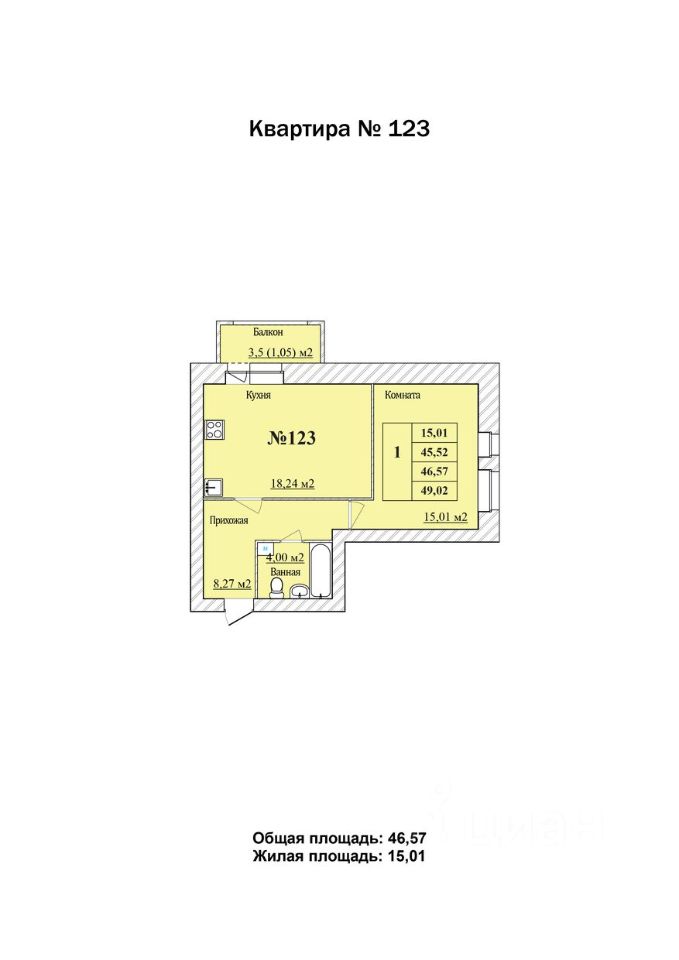 Общая площадь46,57 м2