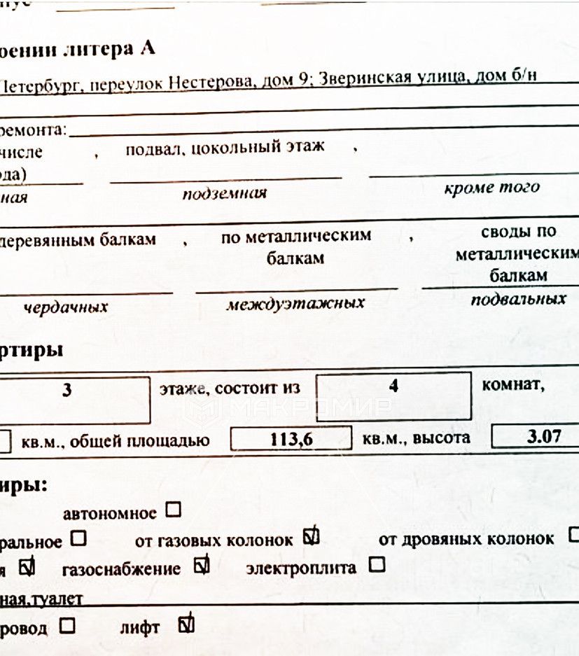Арт. 128364163 Продается уникальная, душевная 3 квартира для ценителей исторического центра Санкт-Петербурга, полностью готовая для проживания, можно въехать и жить. СПб, переулок Нестерова,9 (угол со Зверинской улицей). Дом исторический кирпичный 1910 года постройки ''Доходный дом И. Н. Бороздкина'', стиль Модерн, архитектор - Богуский Л. В. Лепнина родная, идеально отреставрирована. Два действующих входа в квартиру (с улицы Нестерова и со двора). Окна в зеленый сквер (виден Князь-Владимирский собор), перекрытия - металлические балки. Лифт.