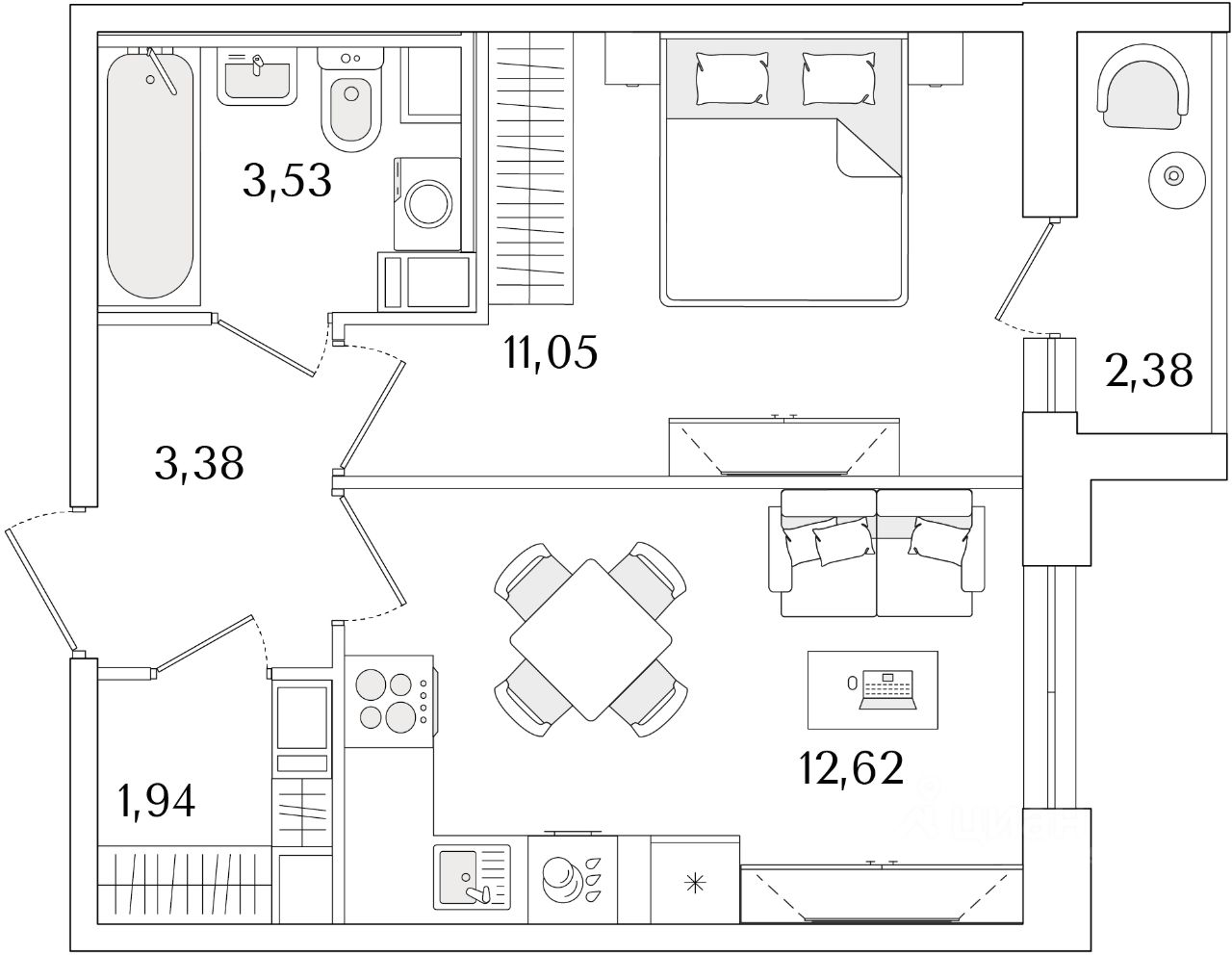 Общая площадь33,71 м2
