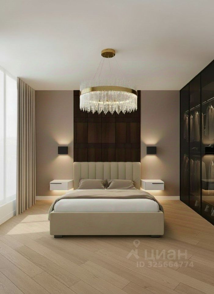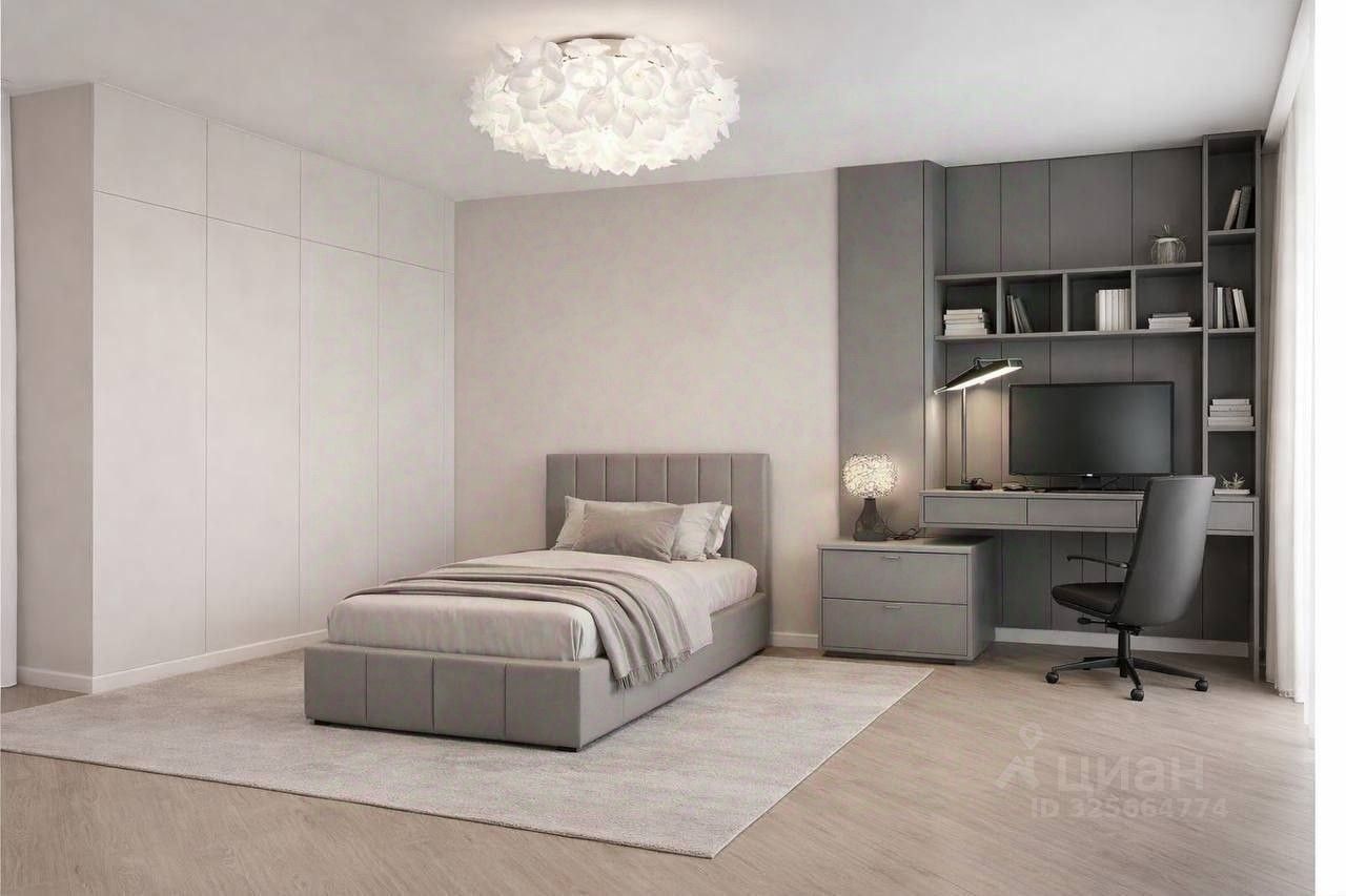 В стоимость также включены: современная кровать с ортопедическим матрасом фирмы Орматек (140 тыс.руб.), мебель в мастер-спальне (подвесные тумбы, туалетный столик), шкафы в рабочей зоне, обеденная группа (дизайнерский раздвижной стол и набор стульев), ТВ-тумба в гостиной.