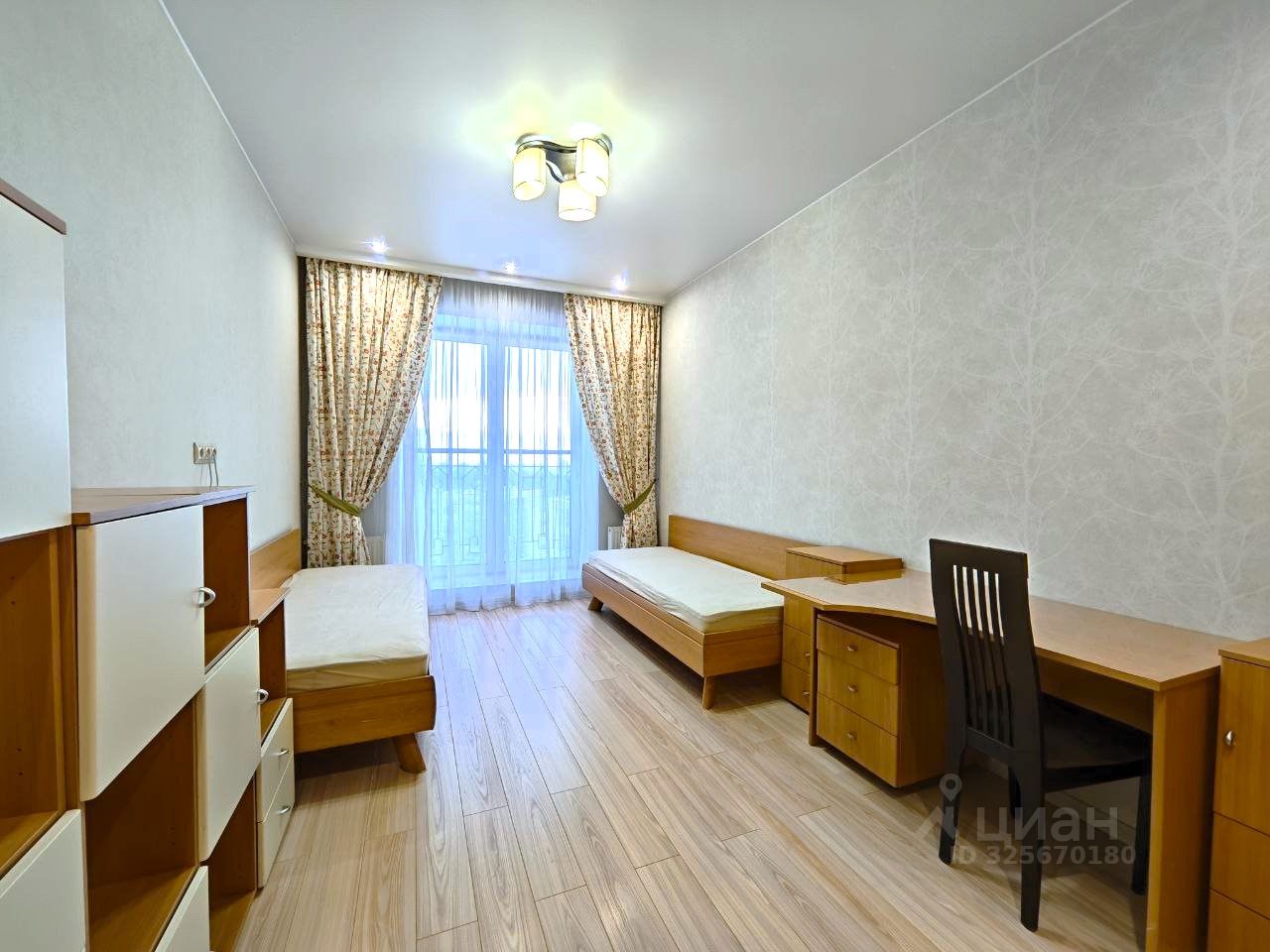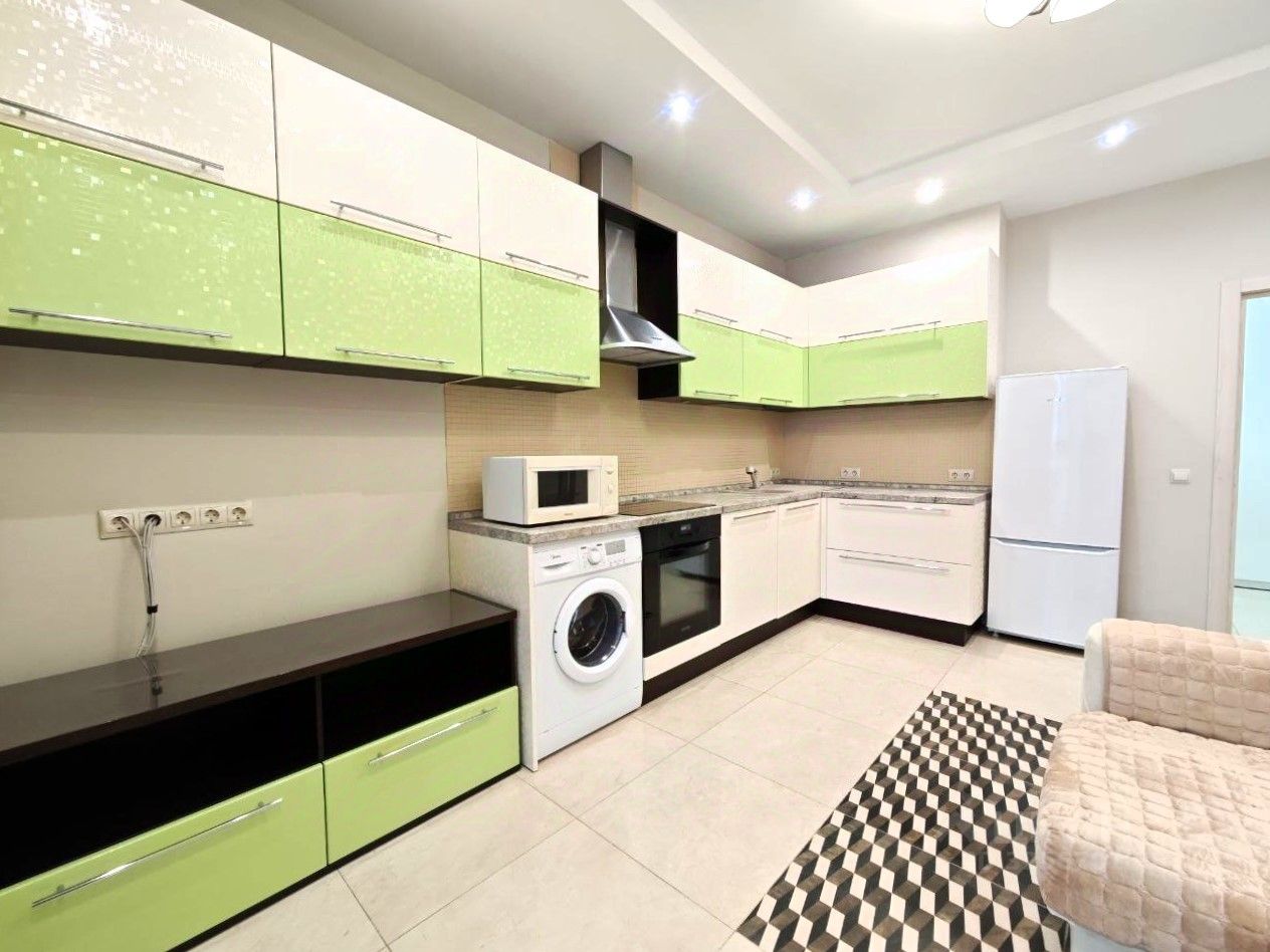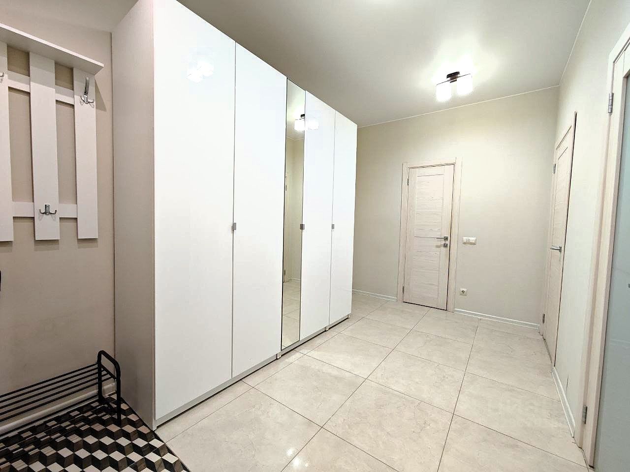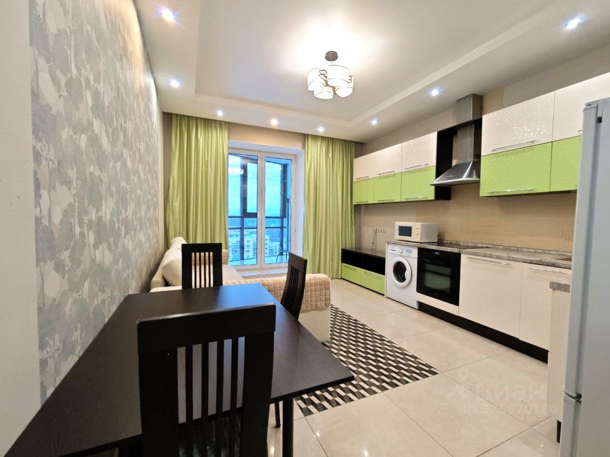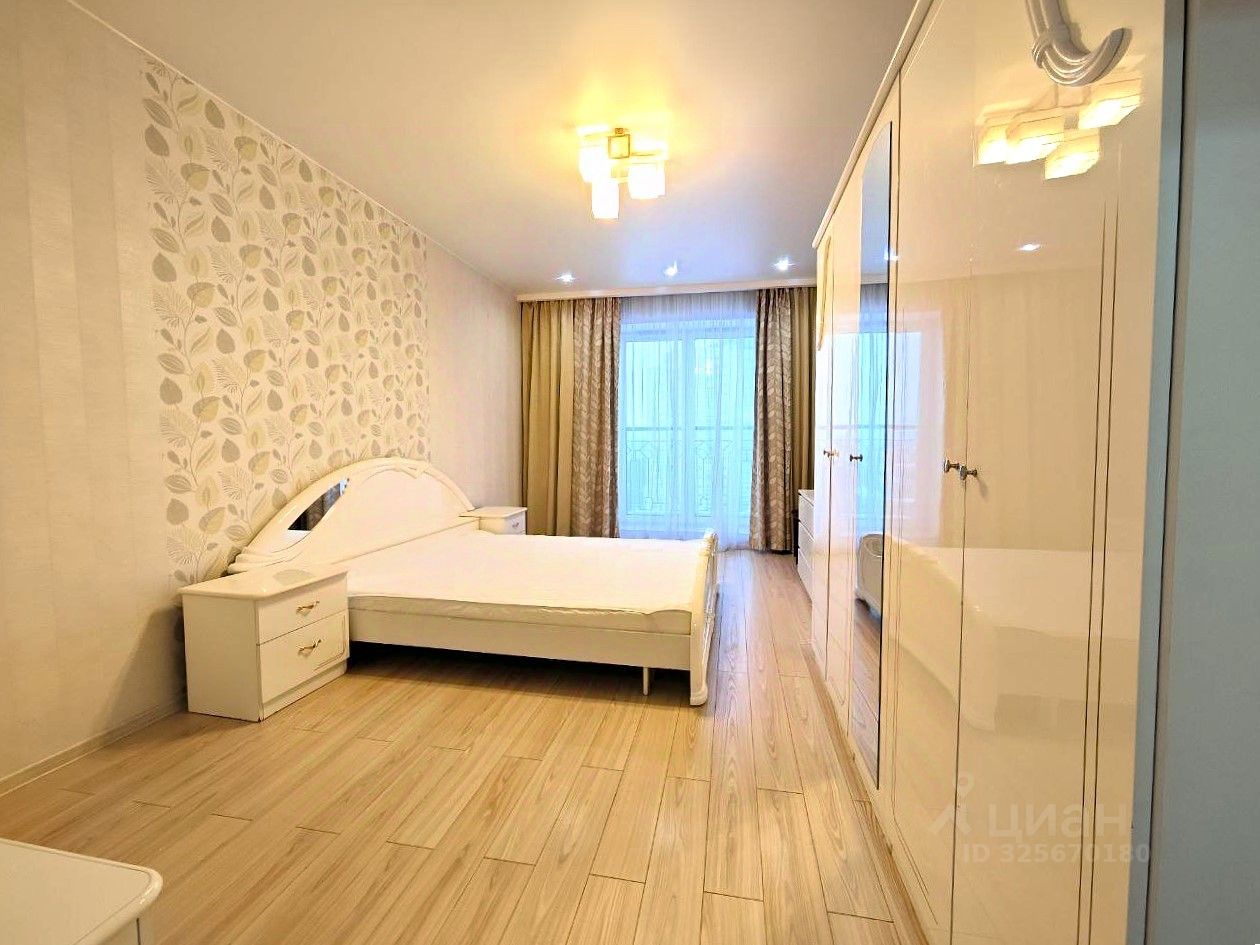Квартира расположена на последнем 17-м этаже. Потолки 3 м. Балкон с тёплым остеклением и тёплым полом, панорамные французские окна. Санузел совмещённый. Установлена необходимая мебель и бытовая техника (холодильник, варочная панель, духовой шкаф, посудомоечная машина, стиральная машина). Одна комната оборудована для двоих детей. Двуспальная кровать в основной спальне, шкафы в коридоре и в комнатах, на балконе.