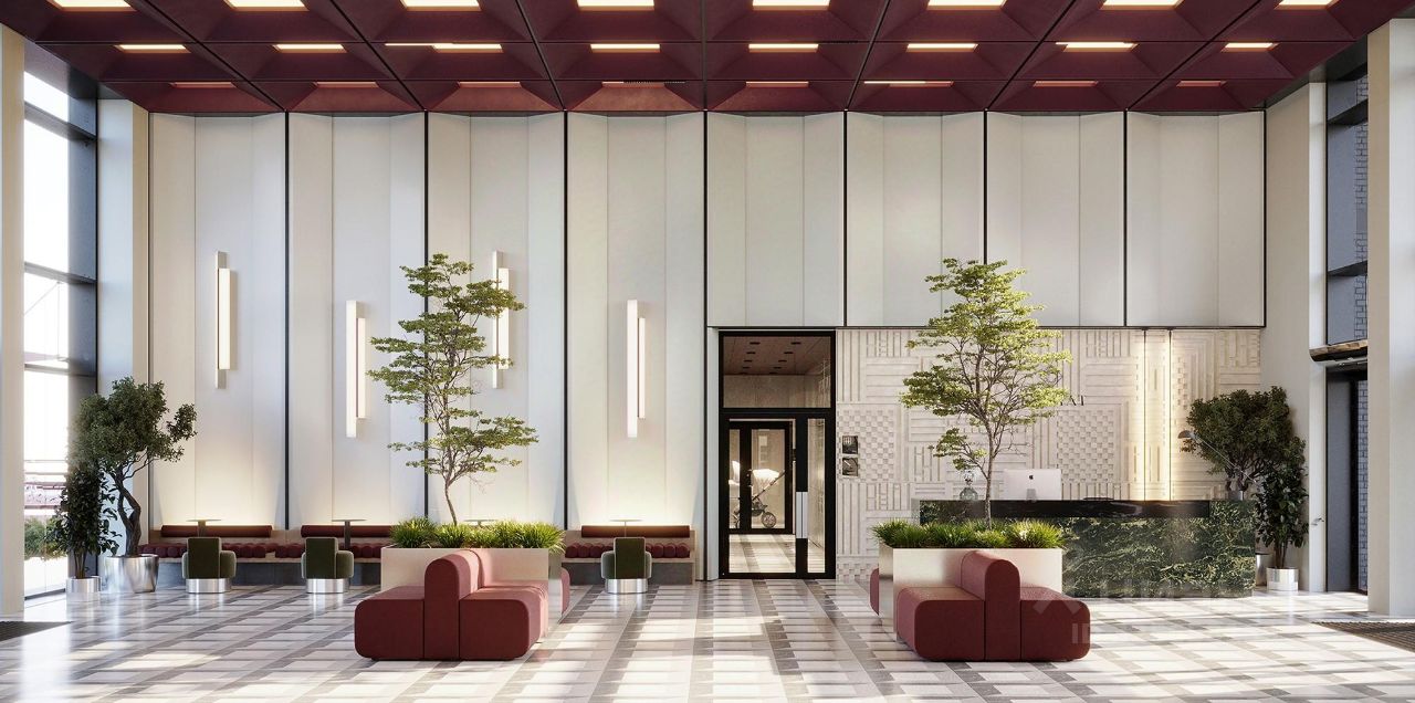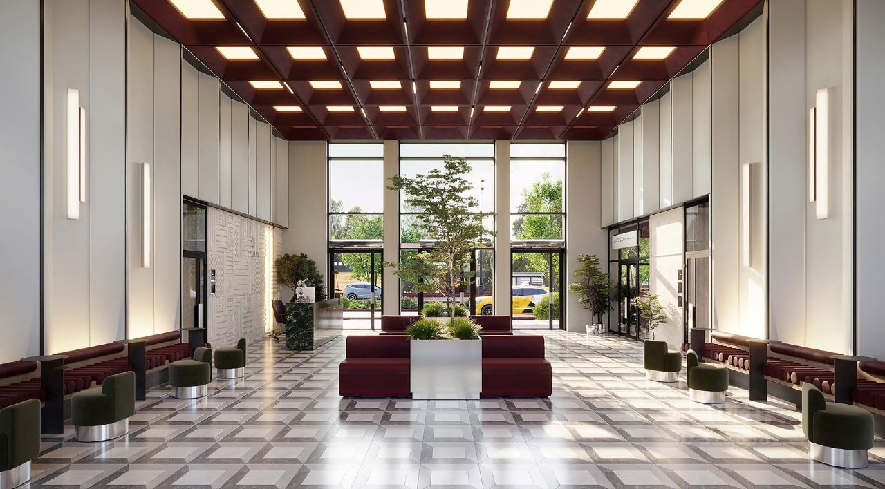 Двусветный холл связывает пространства внутреннего двора и улицы, является порталом в обособленный тихий двор жилого комплекса. Высокие витражи обеспечивают просматриваемость пространства, приглашая пройти внутрь.