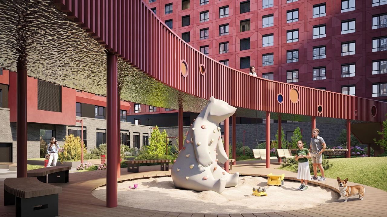 Концепция благоустройства делит пространство всего комплекса на три отдельных двора. Три двора соединены между собой визуально и с помощью шаговых дорожек, утопленных в рельеф. Деревья, кустарники, высокие газоны, рельеф со злаковыми растениями и прочими травами создают ощущение близости к природе.