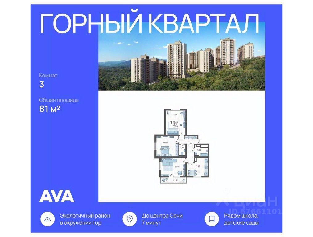 Продается 3-комнатная квартира в доме (Литер 4), срок сдачи : срок сдачи: 3-кв. 2026, общей площадью 81.00 кв.м., на 11 этаже в новом современном жилом комплексе в Сочи ''Горный квартал'', Хостинский район. Отличный вариант для инвестиций и жизни.