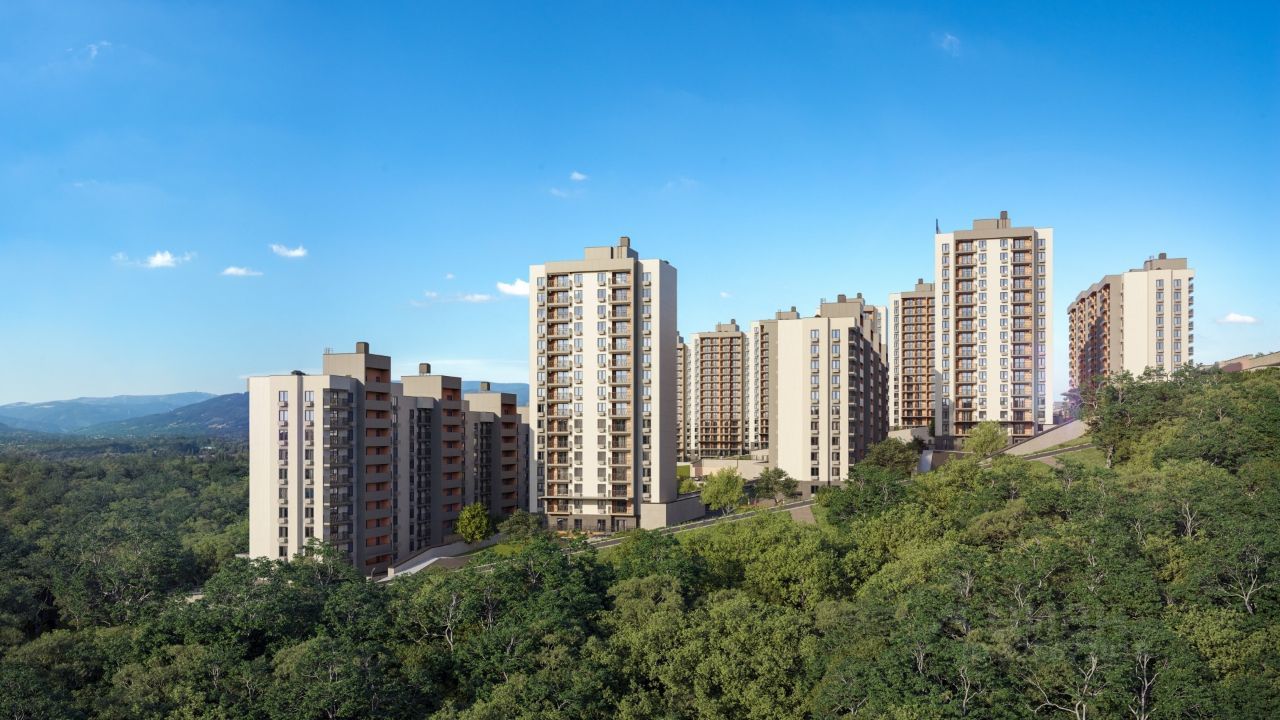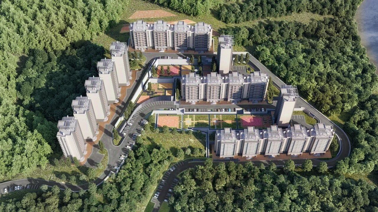 Аккуратный облик домов Жилой комплекс состоит из пяти корпусов высотой от 10 до 16 этажей. Сдержанные фасады в бежево-серых оттенках выглядят аккуратно и гармонируют с природным окружением, а открытые балконы добавляют облику домов легкости. Контейнеры под кондиционеры встроены в фасады и практически незаметны, благодаря чему дома сохраняют опрятный внешний вид. Комплекс расположен на склоне горы, поэтому из окон квартир на верхних этажах открываются отличные панорамные виды на лес, озеро и город: чем выше этаж, тем выразительнее пейзаж.