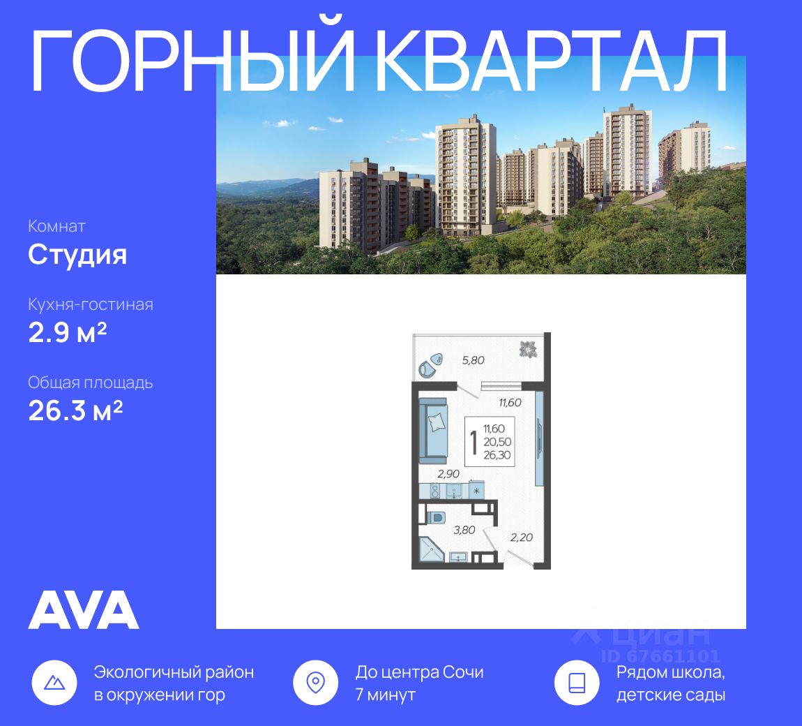 В продаже студия площадью 26.3, расположенная Литер 3 жилого комплекса комфорт+ класса ''Горный квартал''. Комплекс от девелопера AVA находится в Сочи, Хостинского района, в 15 минутах езды от центра города.