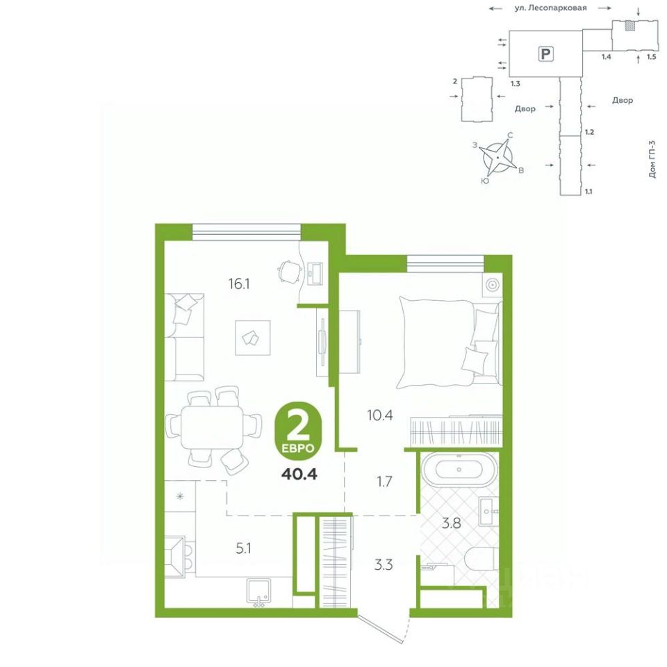 Квартира располагается в ГК ''Чистые Пруды'' от ''Паритет девелопмент''. Это флагманский проект компании в Тюмени. Расположение вдали от шумных улиц и оживленного центра создает ощущение жизни на природе и окружает тишиной и спокойствием. Есть вся необходимая социальная и коммерческая инфраструктура: магазины и сфера услуг на первых этажах. Школы, сады, поликлиника, парки в шаговой доступности. Квартал строится в районе Новой Лесобазы. Рядом выезд на объездную, что существенно экономит время. Поездка до центра города на автомобиле занимает 15-20 минут. Городские кварталы ''Чистые Пруды'' сформирован из домов переменной этажности и многоуровневых паркингов. Ввод 1 очереди строительства запланирован на II кв. 2028 года. Всё благоустройство квартала представлено двумя функциональными зонами: приватная внутри дворовая и общественная. Каждый закрытый двор имеет выход на единую променадную зону - бульвар. Концепция благоустройства основана на принципе модульности, что формирует основную идею приватности. Приватность проекта подчеркивает его особенный климат внутри. Модульное благоустройство позволит максимально эффективно использовать пространство двора и удовлетворить потребности различных категорий жителей. В квартирах базово выполнена улучшенная черновая отделка, которая включает в себя: выровненные стены, стяжка пола с шумоизоляцией, горизонтальная разводка отопления, установлены счетчики с телеметрией, окна с 5-камерным профилем и надежные входные двери. При желании можно добавить ремонт от застройщика и включить его в стоимость ипотеки, что позволит сэкономить на стройматериалах и переехать сразу после получения ключей. Характеристики квартиры: этаж - 2 количество комнат - 2 номер помещения - 279 площадь квартиры - 40,4 кв.мГармоничные пропорции и большие окна наполняют пространство светом, создавая уютную атмосферу. Умное зонирование позволяет удобно организовать как рабочую, так и жилую зоны, что особенно важно для современных жителей. Санузел спроектирован с учетом всех потребностей: здесь есть ванна и место для стиральной машины. Каждый метр квартиры используется с максимальной эффективностью, что делает эту планировку отличным выбором для тех, кто ценит комфорт и удобство.