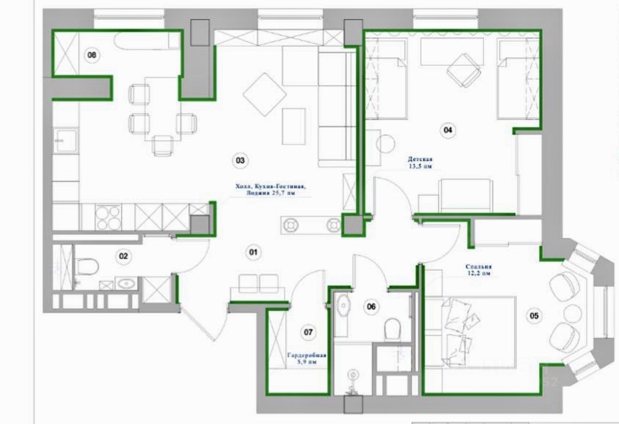 Основные характеристики квартиры •Общая площадь: 75 кв.м. •Две изолированные спальни: 13 и 16.5 кв.м. отлично подойдут для взрослых и детей. •Просторная кухня-гостиная: 25 кв.м. — сердце квартиры для семейных вечеров и приёма гостей. •Два санузла: Один из них с душевой кабиной — больше удобства для всей семьи. •Гардеробная при входе: Всё под рукой и всегда на своём месте.