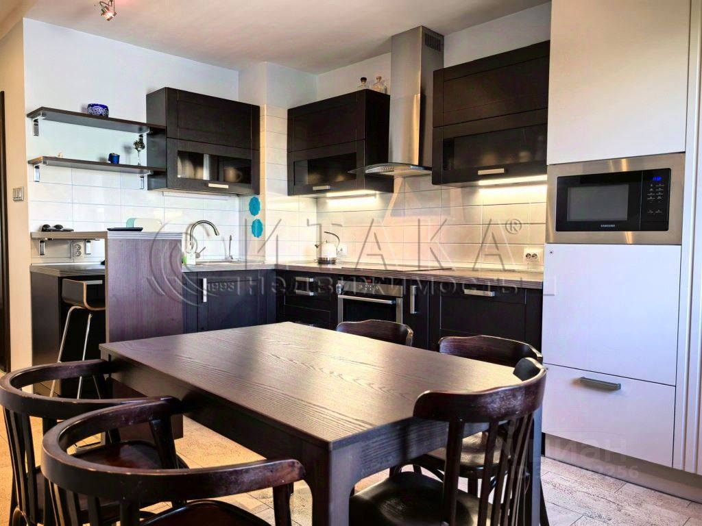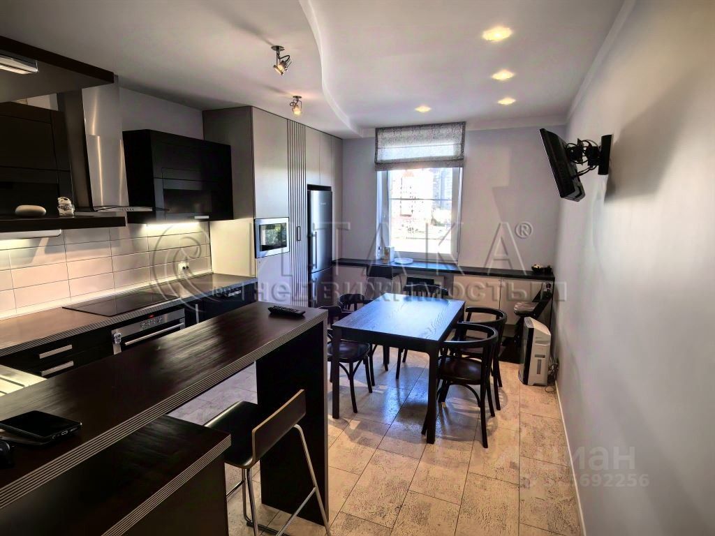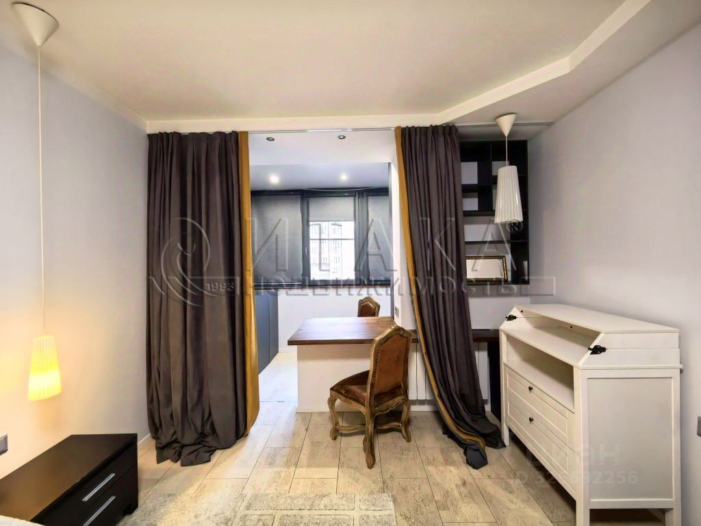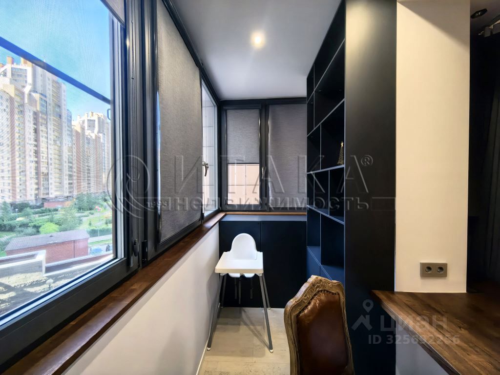 Квартира имеет кухню 16 м², две комнаты 19 и 18,6 м², отдельное помещение для стиральной машины. Выполнен качественный ремонт с пробковыми полами, продуманным освещением. Лоджия с тёплым остеклением и подогревом пола. Встроенные системы хранения: шкаф-купе и гардеробные.