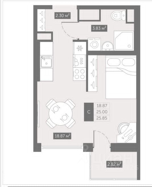 - Характеристики квартиры: *Общая площадь - 25,85 м2, *Жилая зона - 18,87 м2, *Санузел - 3,83 м2, *Прихожая - 2,30м2, *Балкон - 2,82 м2 (с остеклением), *Высота потолков - 2,72 м, *Этаж - 7 (Секция 1), *Окна на Юго-Восток.