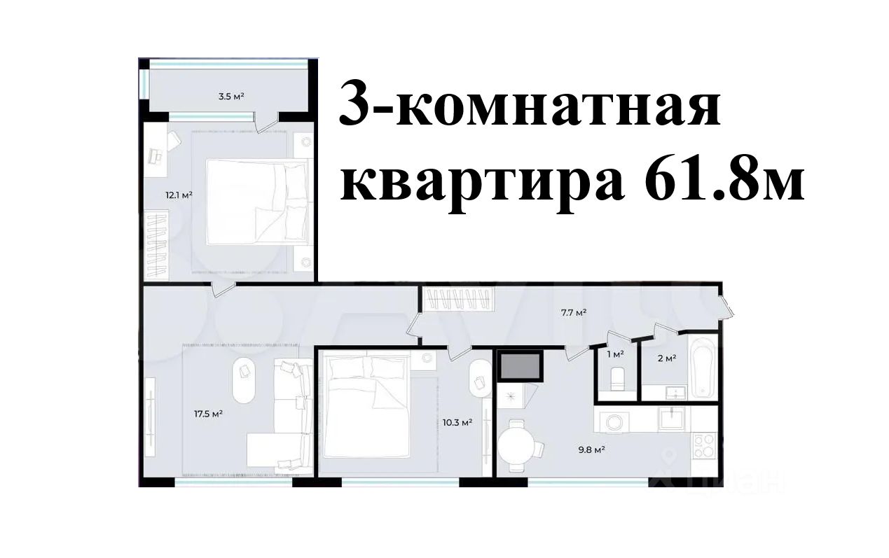 О квартире: - общая площадь 61,8 кв м + лоджия 3,5 кв м - 3 просторные комнаты (17,5 + 12,1 + 10,3 кв м) - кухня 9,8 кв м - раздельный санузел - 2 антресоли - двусторонняя планировка(распашонка)