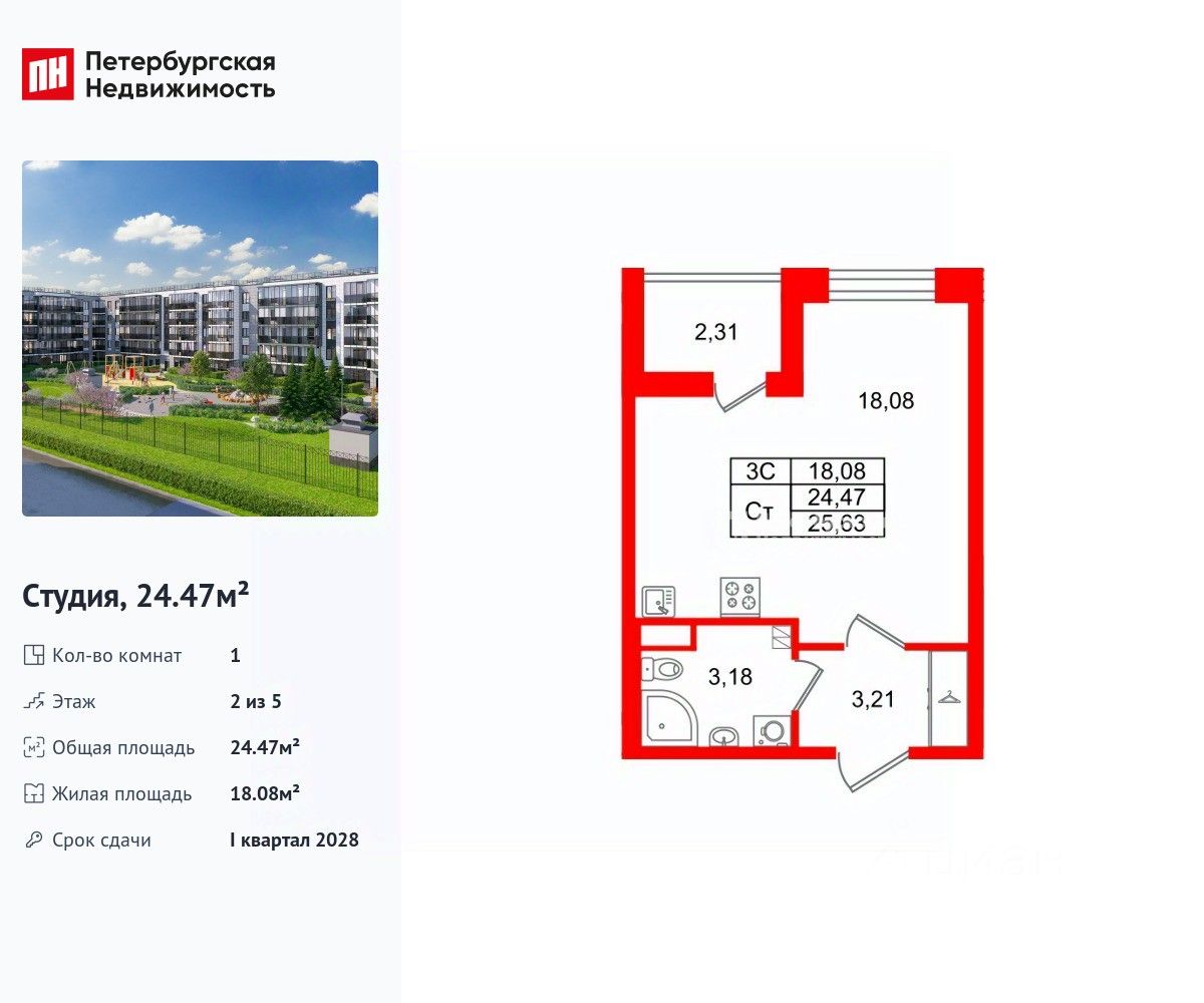 Удобная, классическая, функциональная европланировка, просторная прихожая 3.21 м². Общая площадь студии - 24.47 м², жилая 18.08 м², высота потолка 2.77 м.
