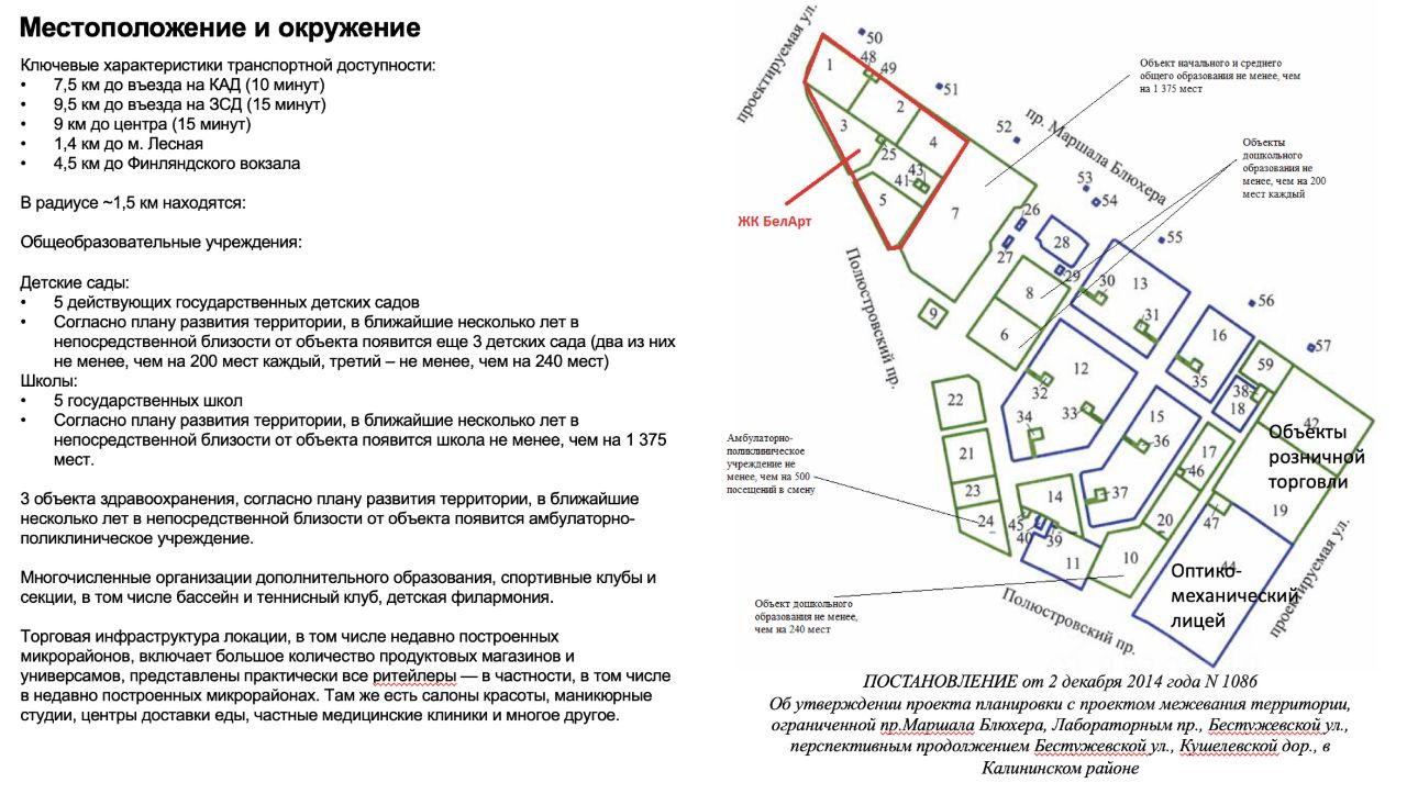 О ЖИЛОМ КОМПЛЕКСЕ: Это престижный и перспективный район благодаря близости к центру и развитой транспортной сети. До станции метро Лесная 1,4 км, а до Финляндского вокзала 4,5 км. Ближайшие остановки общественного транспорта расположены всего в 50 м от комплекса. Ближайший въезд на КАД находится в 7,5 км, на 3СД в 9,5 км, а до центра города всего 9 км.