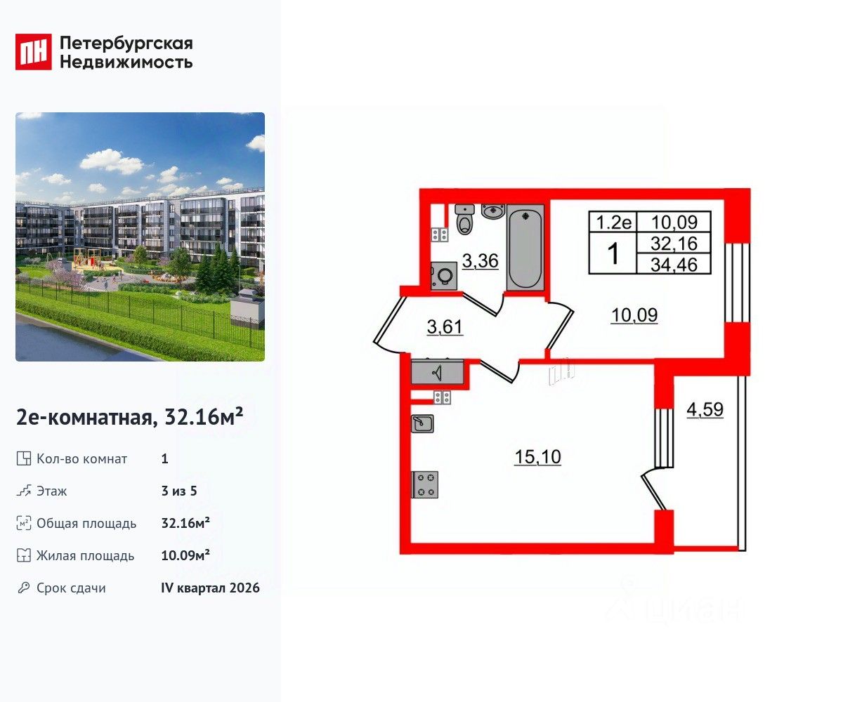 Удобная, классическая, функциональная европланировка, большая кухня-гостиная 15.1 м², вместительная прихожая 3.61 м². Общая площадь квартиры - 32.16 м², жилая 10.09 м², высота потолка 2.77 м.