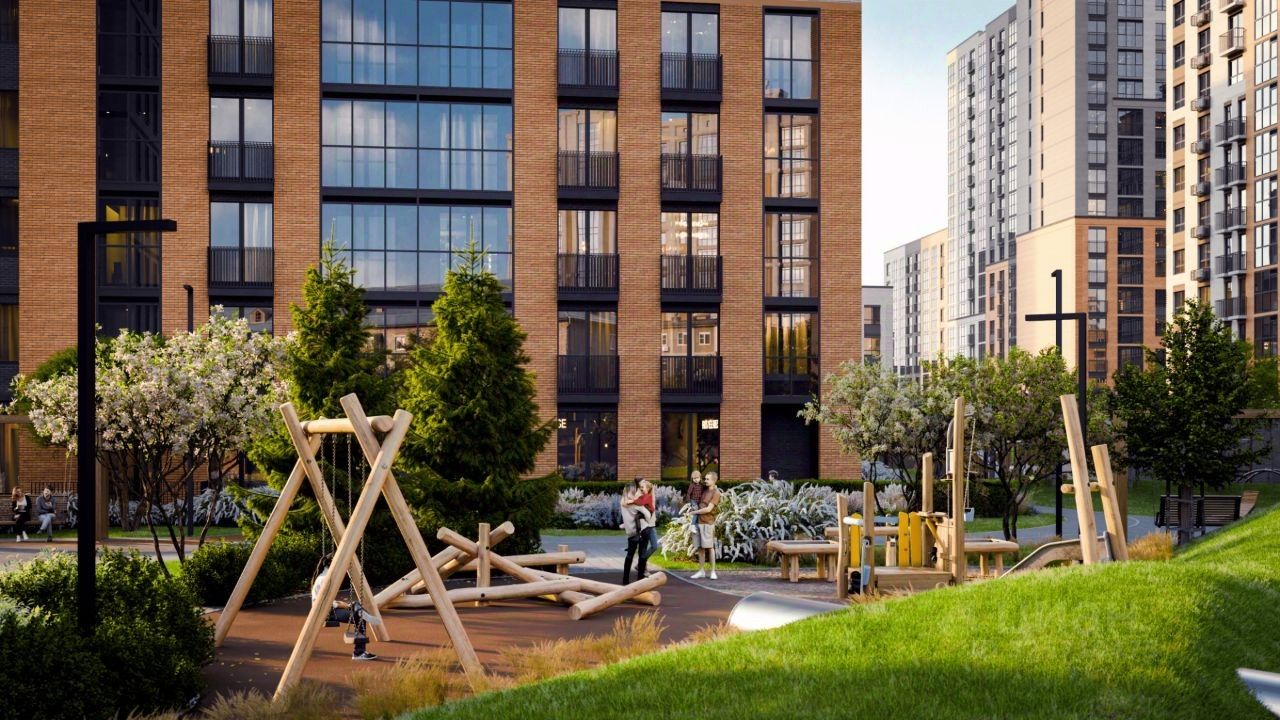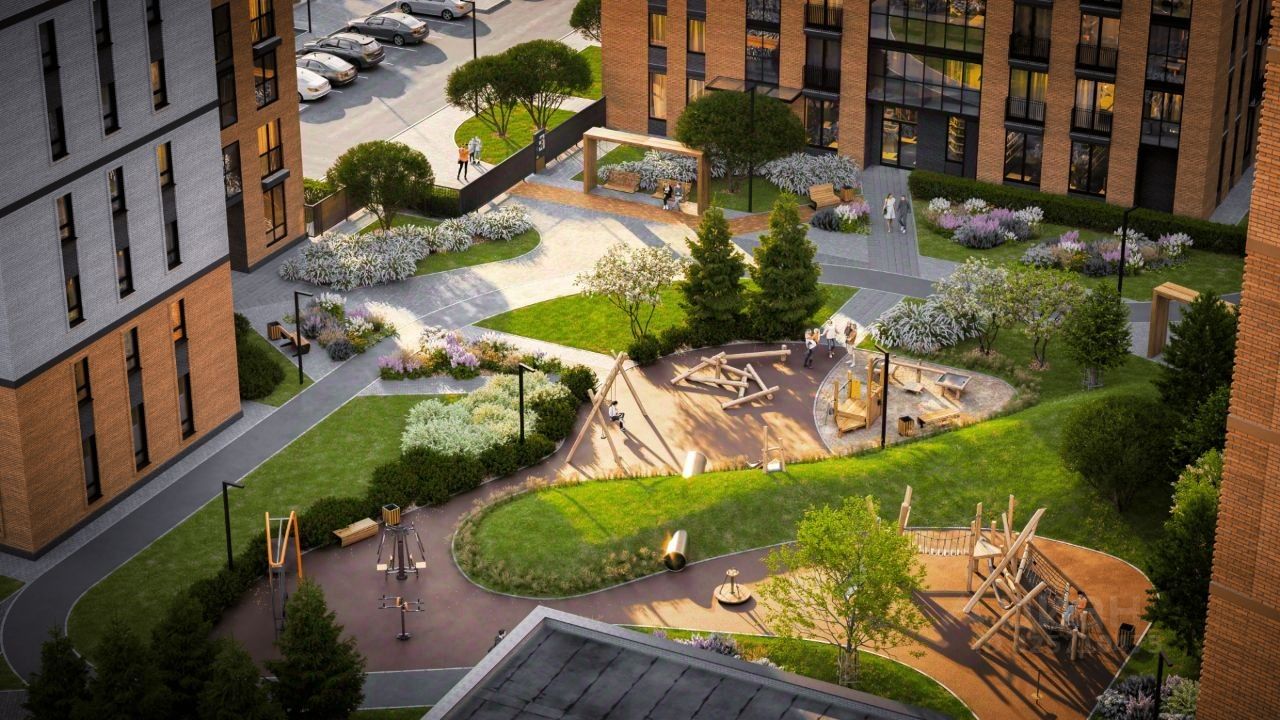 ДВОР Территория ЖК запроектирована как закрытый для посторонних, тихий двор без машин. На внутреннем периметре размещаются развивающие детские игровые зоны и спортивные площадки на бесшовном резиновом покрытии, а также места для отдыха взрослых. Озеленение проводится в виде посадки кустарников, газонов и цветников. Для владельцев личного авто предусмотрен подземный паркинг на 181 место. Спуститься на парковку можно на лифте, а управление шлагбаумом и воротами проводится по брелокам с датчиками доступа.