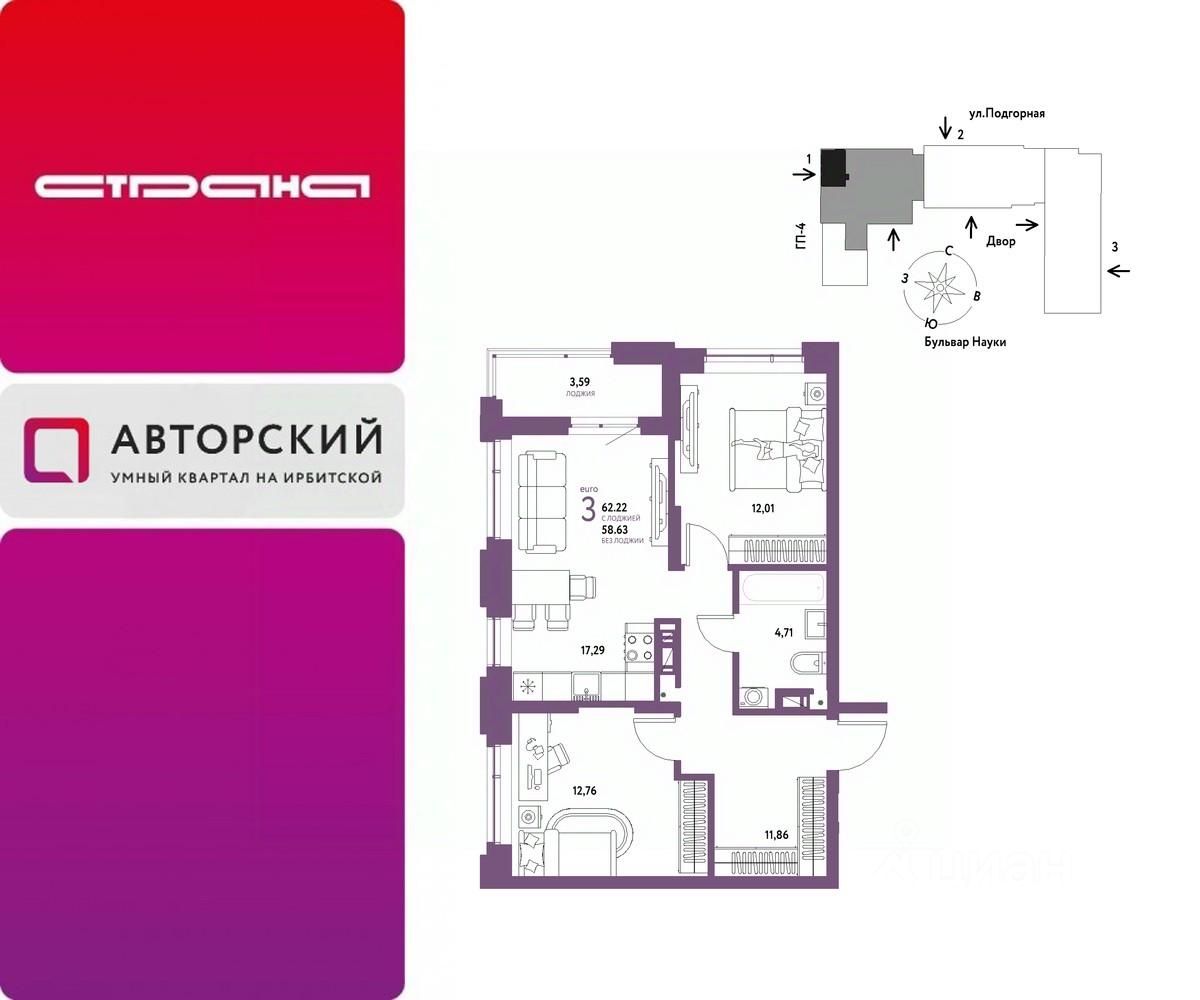 Продается 3комнатная квартира на 15 этаже от застройщика Страна Девелопмент. Площадь квартиры 62,22 кв. м.