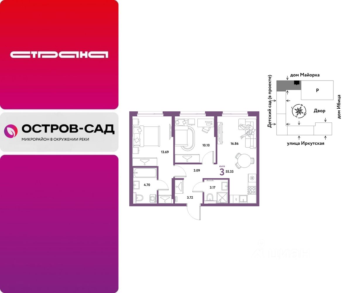 Продаётся 3-комнатная квартира в строящемся доме (Дом Тенерифе (ГП-2Я)), срок сдачи: IV-кв. 2027, общей площадью 55.33 кв.м., на 6 этаже. Новый жилой комплекс ''Остров-сад'' от Специализированного застройщика ''Страна. Коммунистическая'' расположен по адресу: г. Тюмень, по ул. Ярославская.
