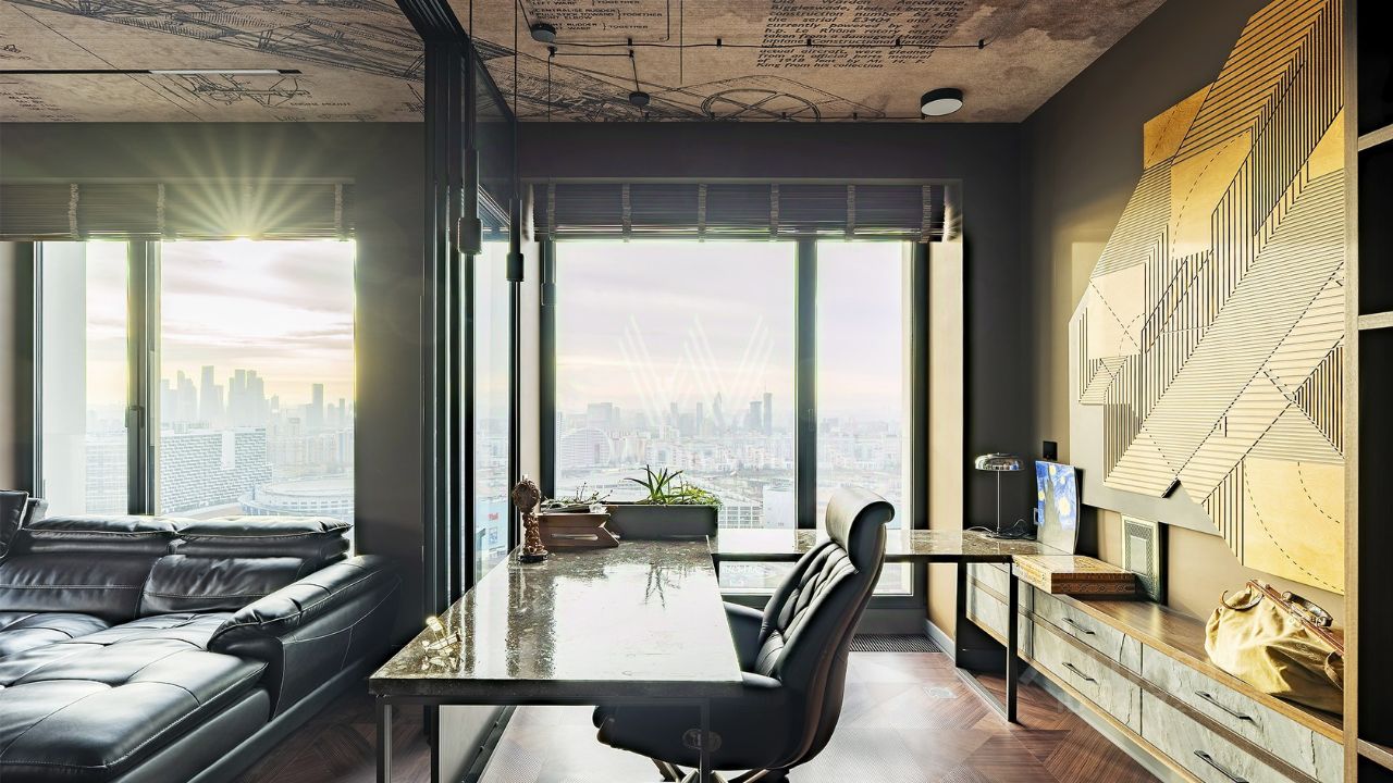 Видовая квартира с 2 спальнями общей площадью 90 м² в комплексе премиум-класса Prime Park с презентабельной входной группой от британского бюро Dyer. Квартира расположена на 31 этаже, откуда открываются панорамные виды на город и башни ''Москва-Сити''. Выполнена дизайнерская отделка по индивидуальному проекту. Интерьер оформлен в современном стиле с уклоном в авиацию.