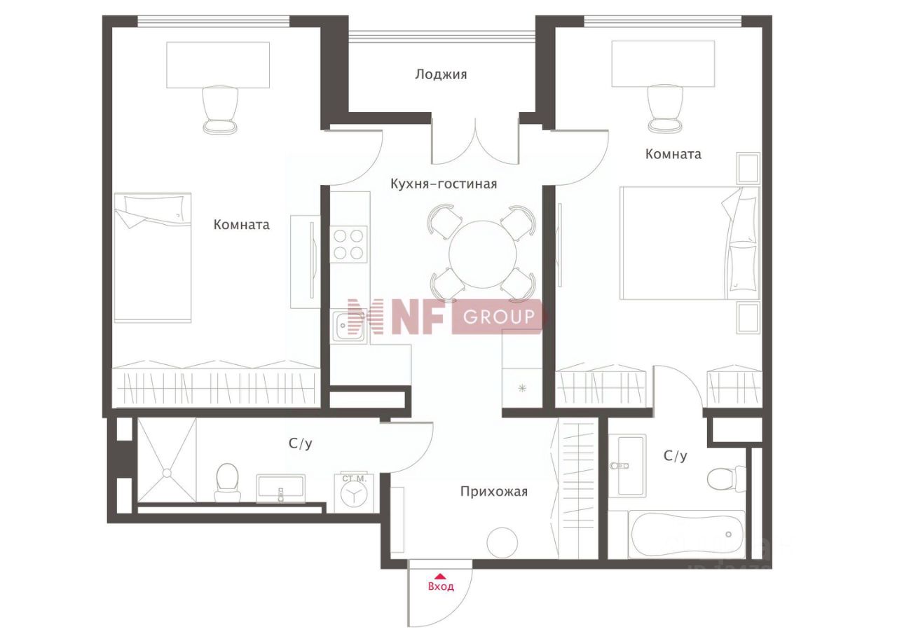 — две комнаты по 19 кв. м — мастер-спальня со входом в свой сан-узел с ванной, предусмотрена гардеробная — второй сан-узел c душем и постирочной — кухня-гостиная 14,4 кв. м с панорамным окном-дверью на лоджию — гардеробная при входе — широкий холл