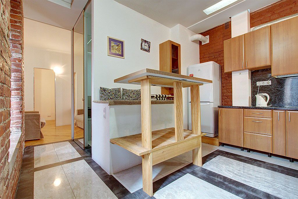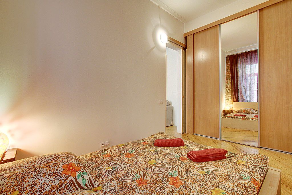 Квартира состоит из спальни, гостиной, кухонной зоны, ванной комнаты и рассчитана на 4х гостей: в спальне находится двуспальная кровать, в гостиной диван-кровать. Также в квартире есть телевизор и городской телефон.