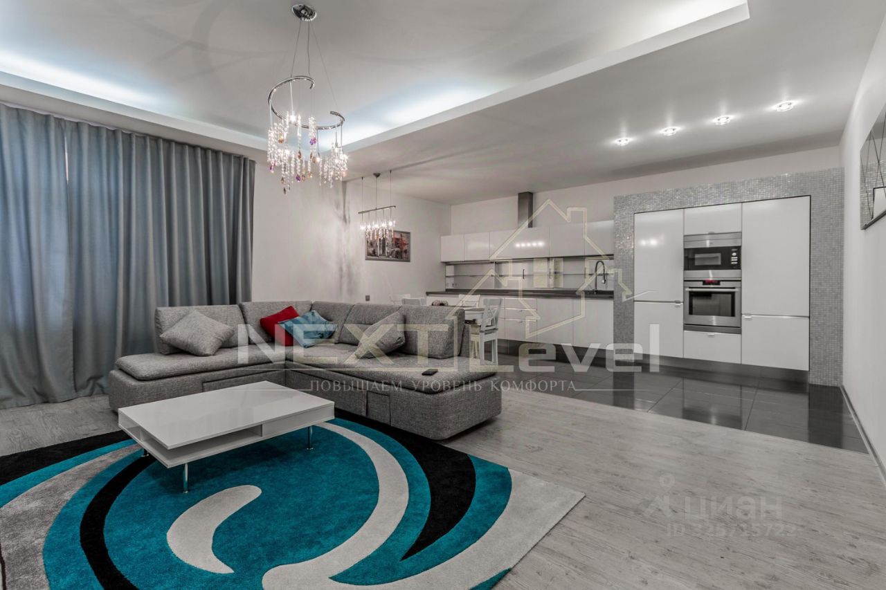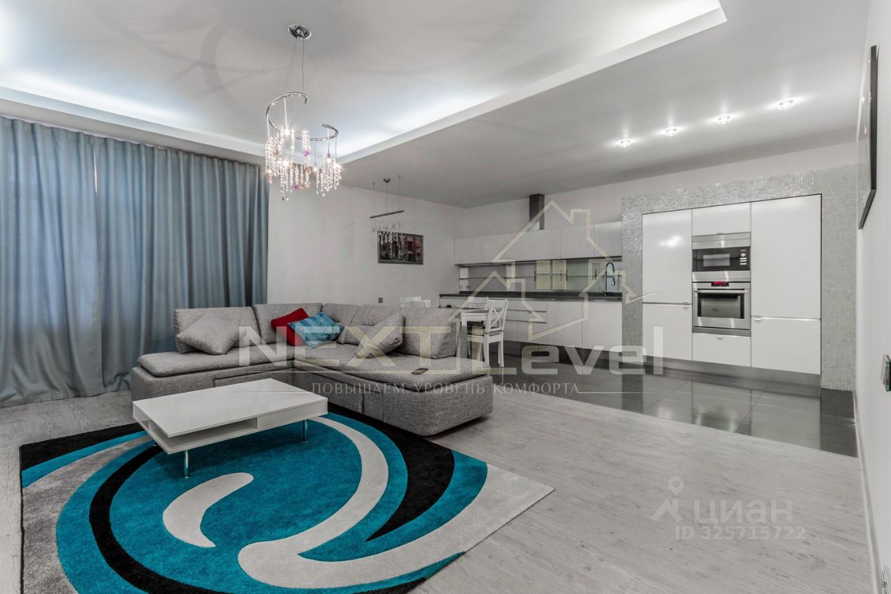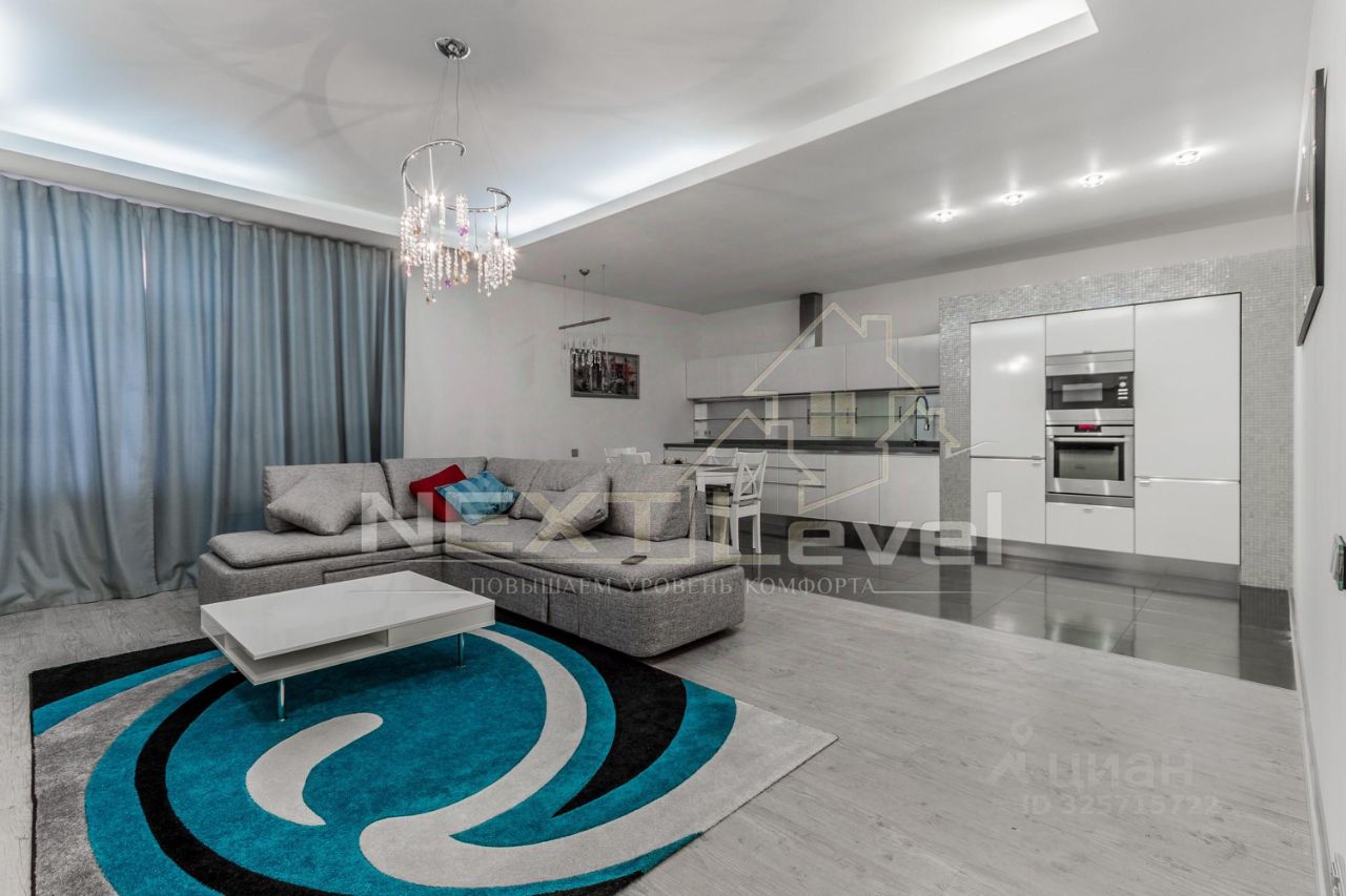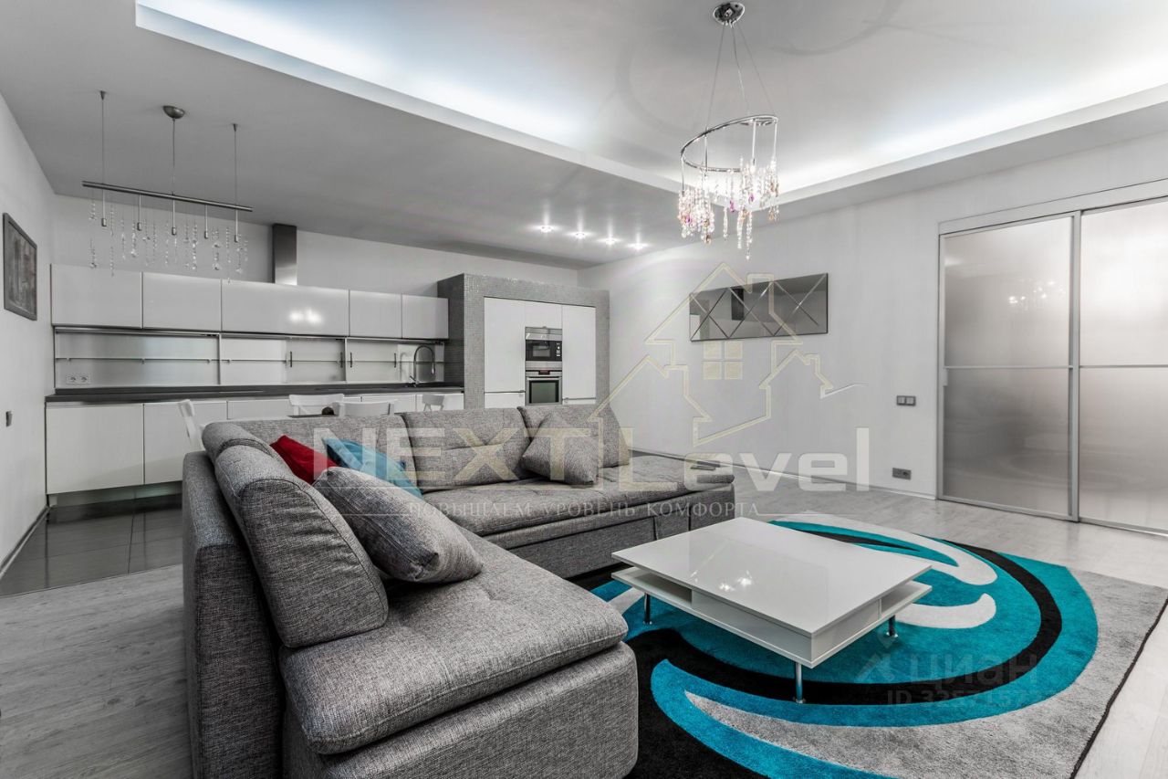 По планировке квартира состоит из просторной кухни, гостиной, спальной комнаты, гардеробной комнаты, двумя санузлами. Общая площадь 107м2.