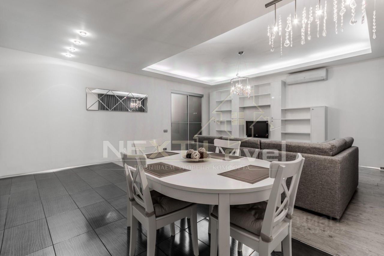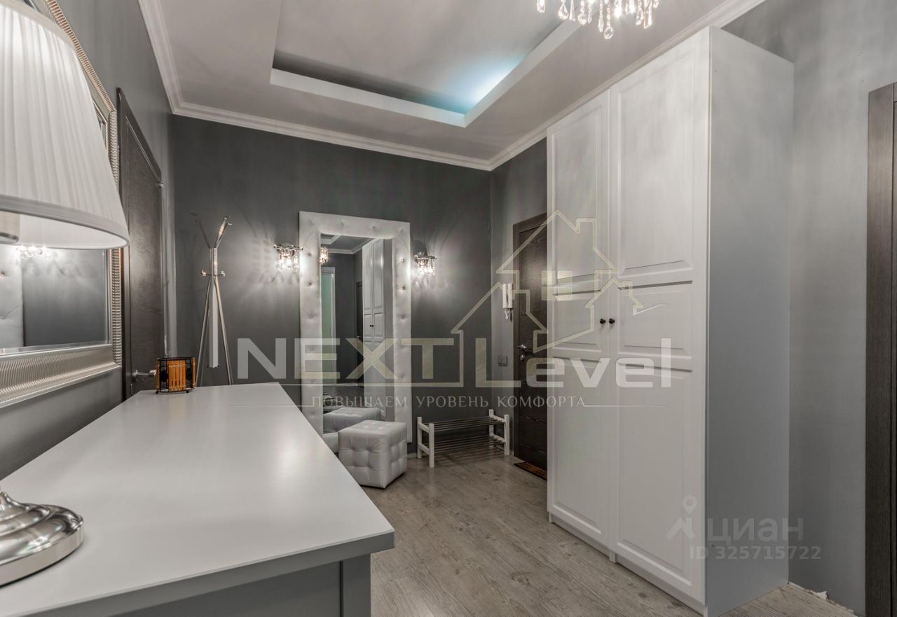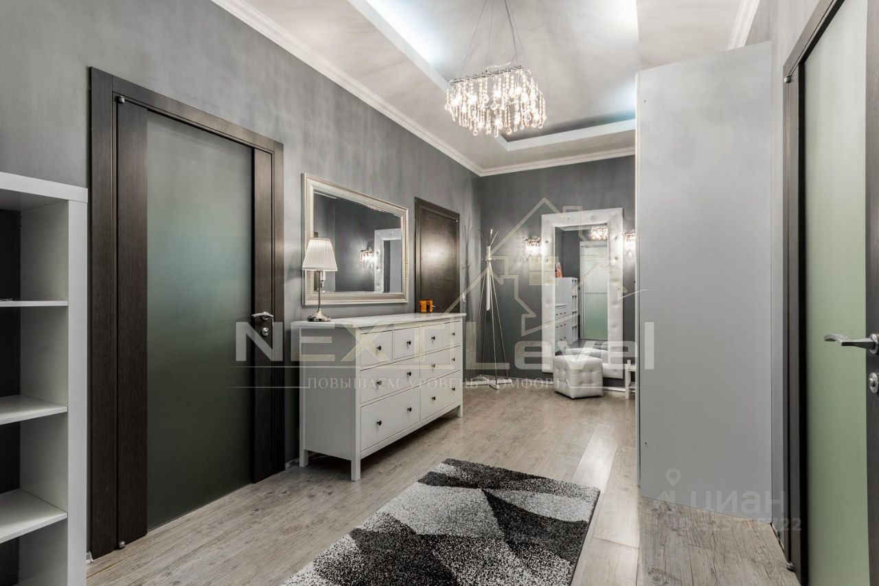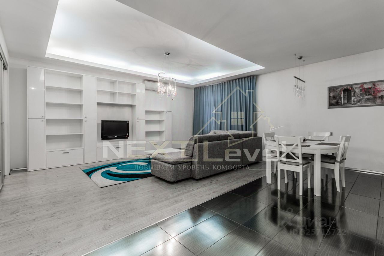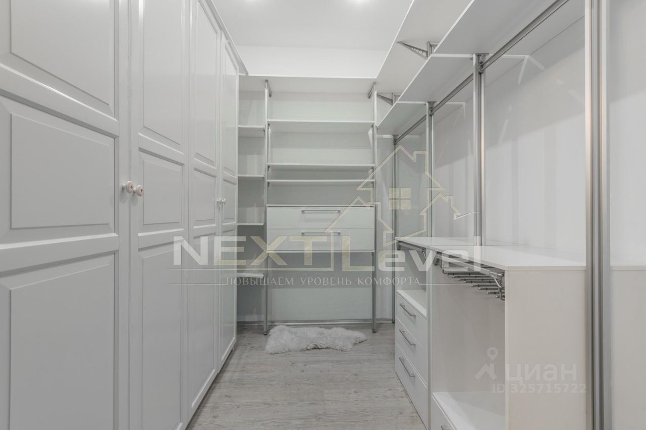 По планировке квартира состоит из просторной кухни, гостиной, спальной комнаты, гардеробной комнаты, двумя санузлами. Общая площадь 107м2.