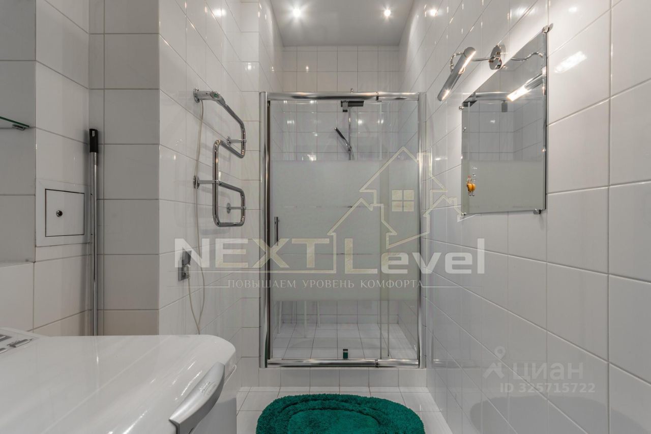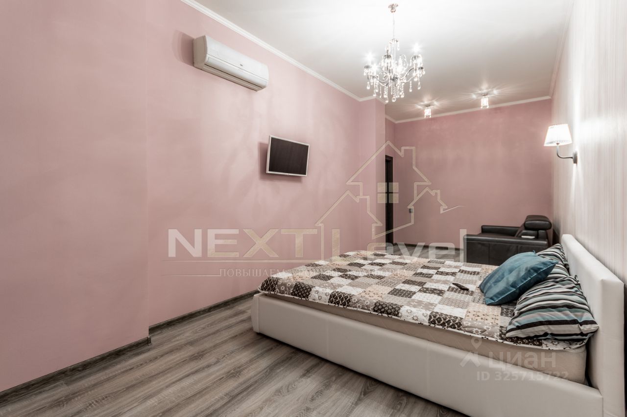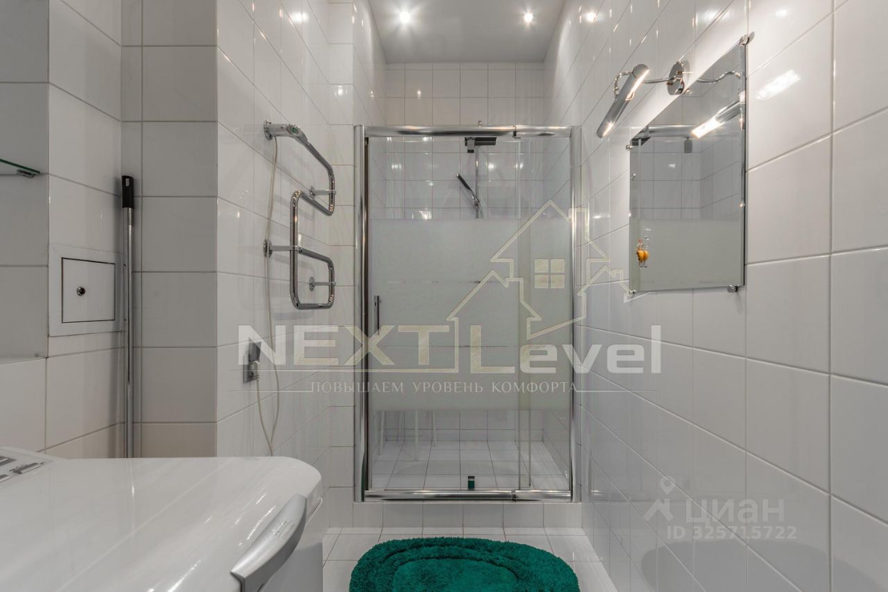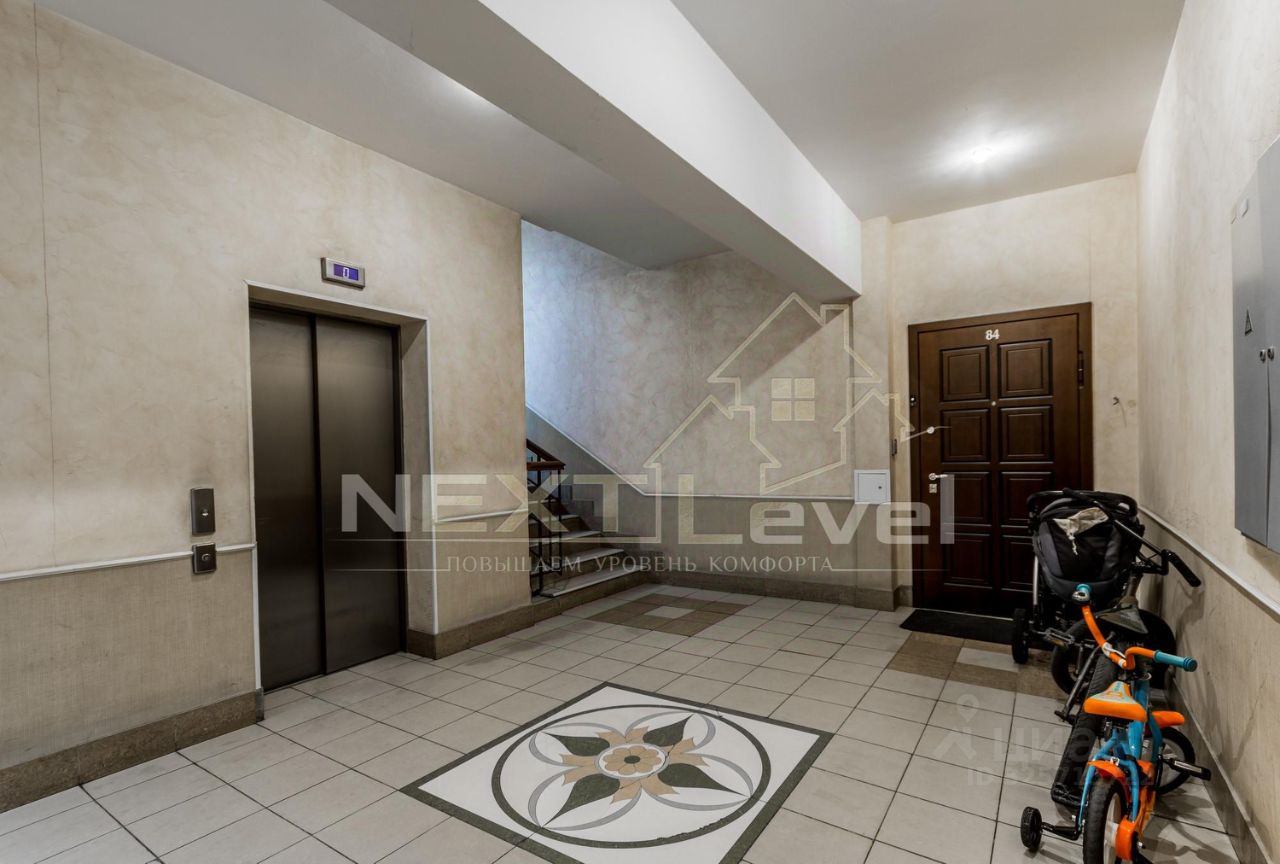 По планировке квартира состоит из просторной кухни, гостиной, спальной комнаты, гардеробной комнаты, двумя санузлами. Общая площадь 107м2.