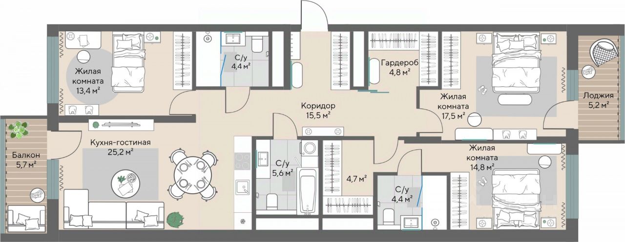 Продаётся 3-комнатная квартира в строящемся доме (Секции 1.4-1.6 (2 очередь)), срок сдачи: IV-кв. 2026, общей площадью 114.5 кв.м., на 11 этаже.