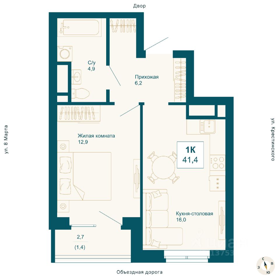 Общая площадь41,4 м2