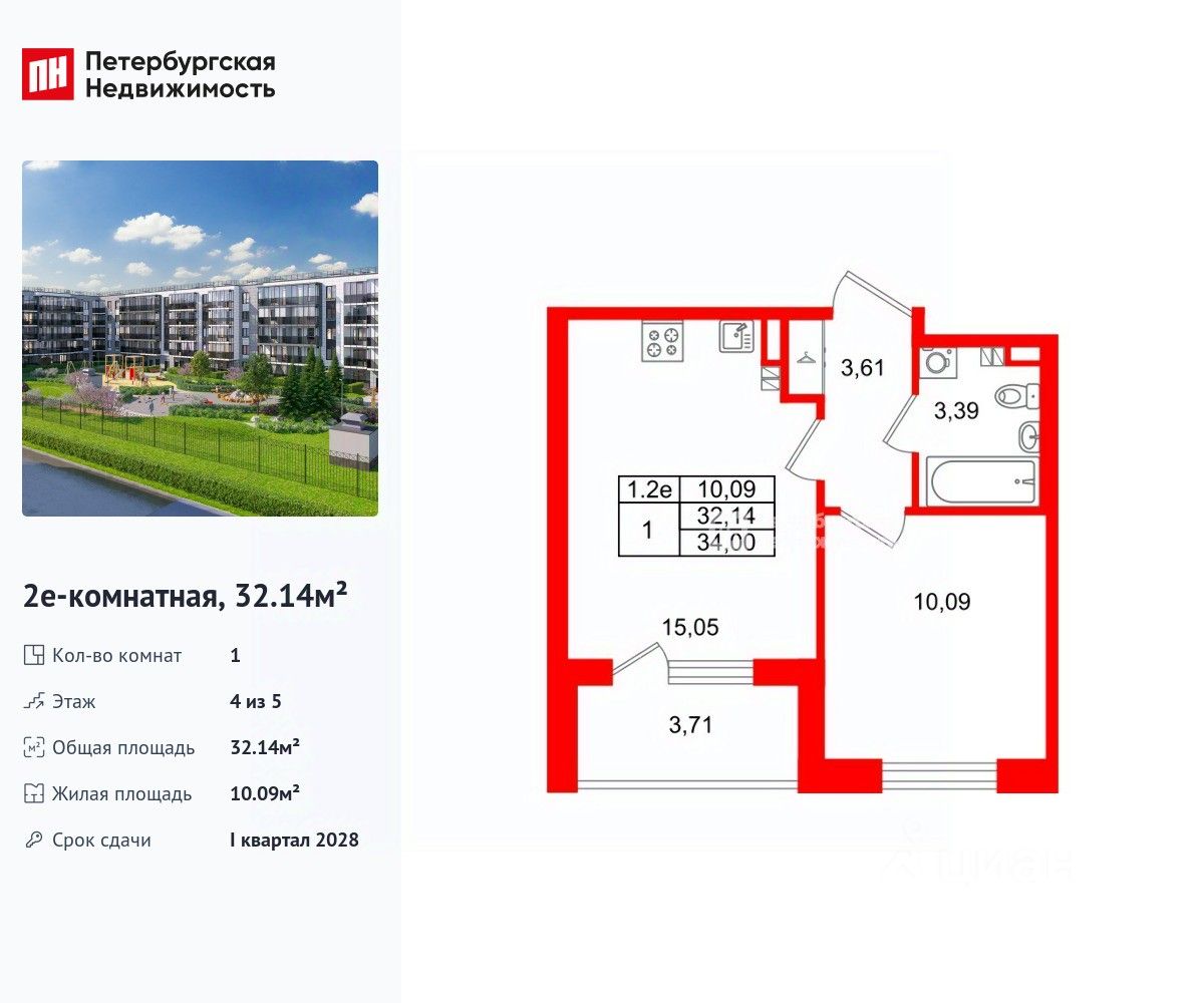 Удобная, классическая, функциональная европланировка, большая кухня-гостиная 15.05 м², вместительная прихожая 3.61 м². Общая площадь квартиры - 32.14 м², жилая 10.09 м², высота потолка 2.77 м.