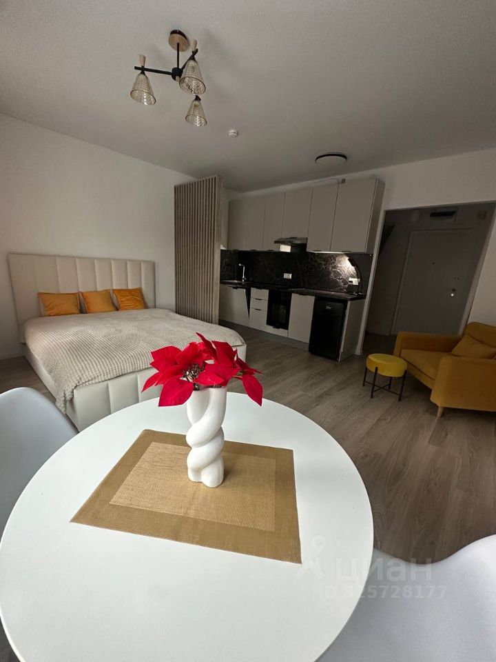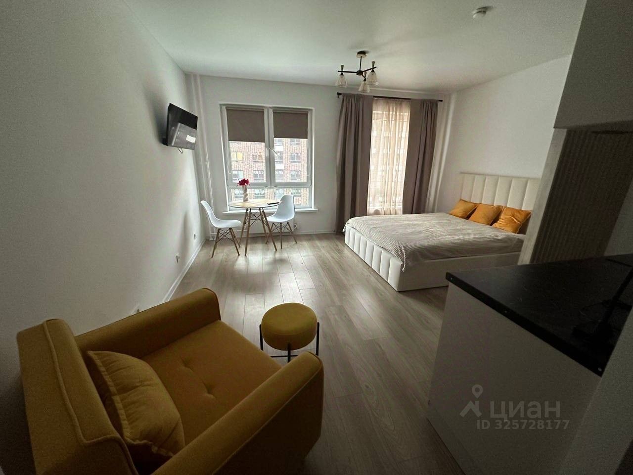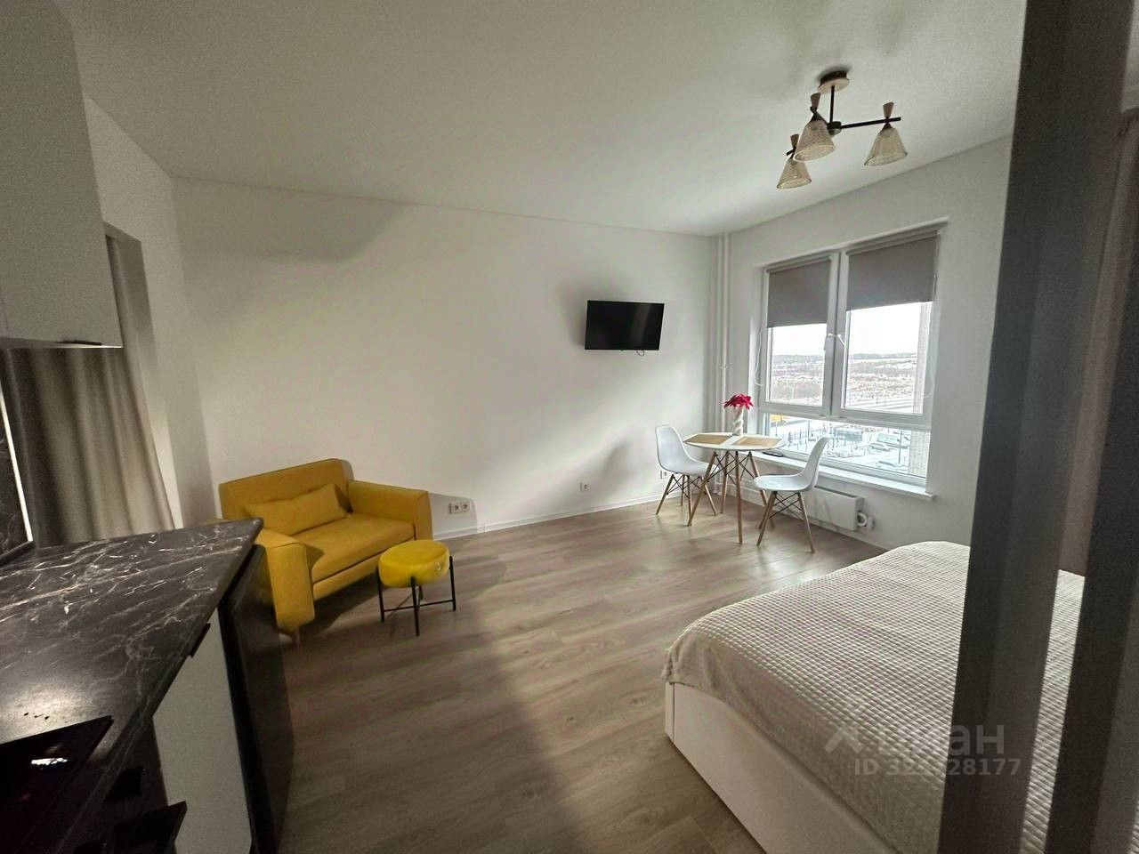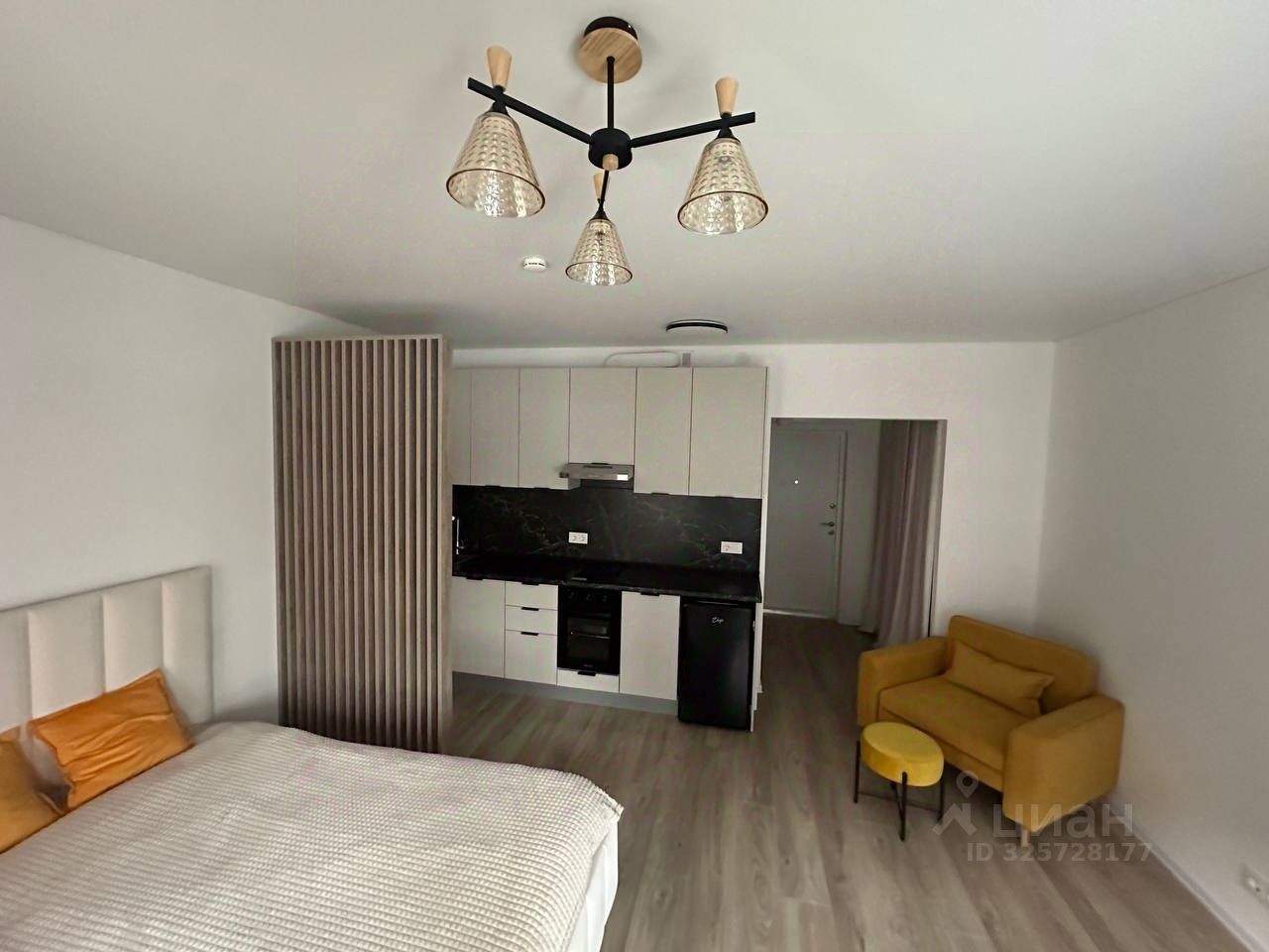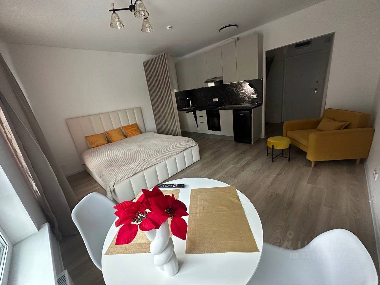 Уютная студия с хорошей кухней и всей необходимой техникой, включая посудомоечную машину. Ремонт делала для себя, хорошая просторная кровать, отделенная декоративной реечной панелью от кухни, раскладное удобное кресло (можно использовать для ребенка), телевизор, кухонный стол у окна с приятным видом, большой шкаф и достаточно места для хранения вещей.