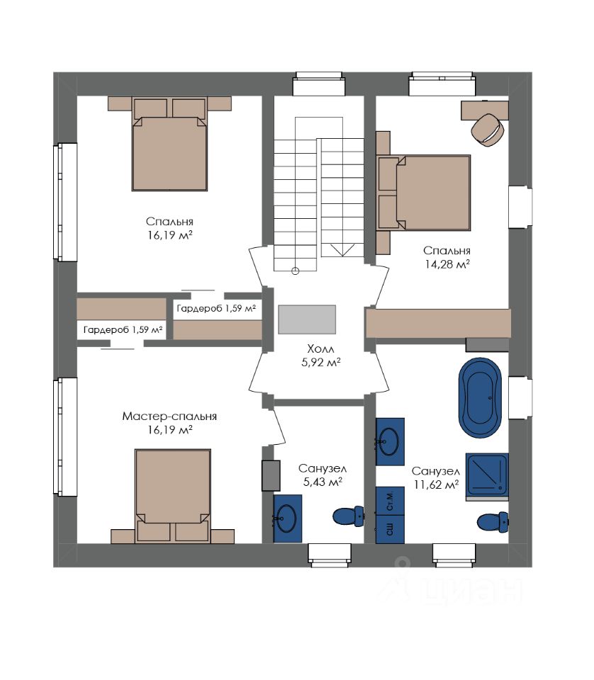 На втором этаже комфортная мастер-спальня 23 м²со своим санузлом и гардеробом, две отдельные спальни по 16 м² и 14 м², санузел