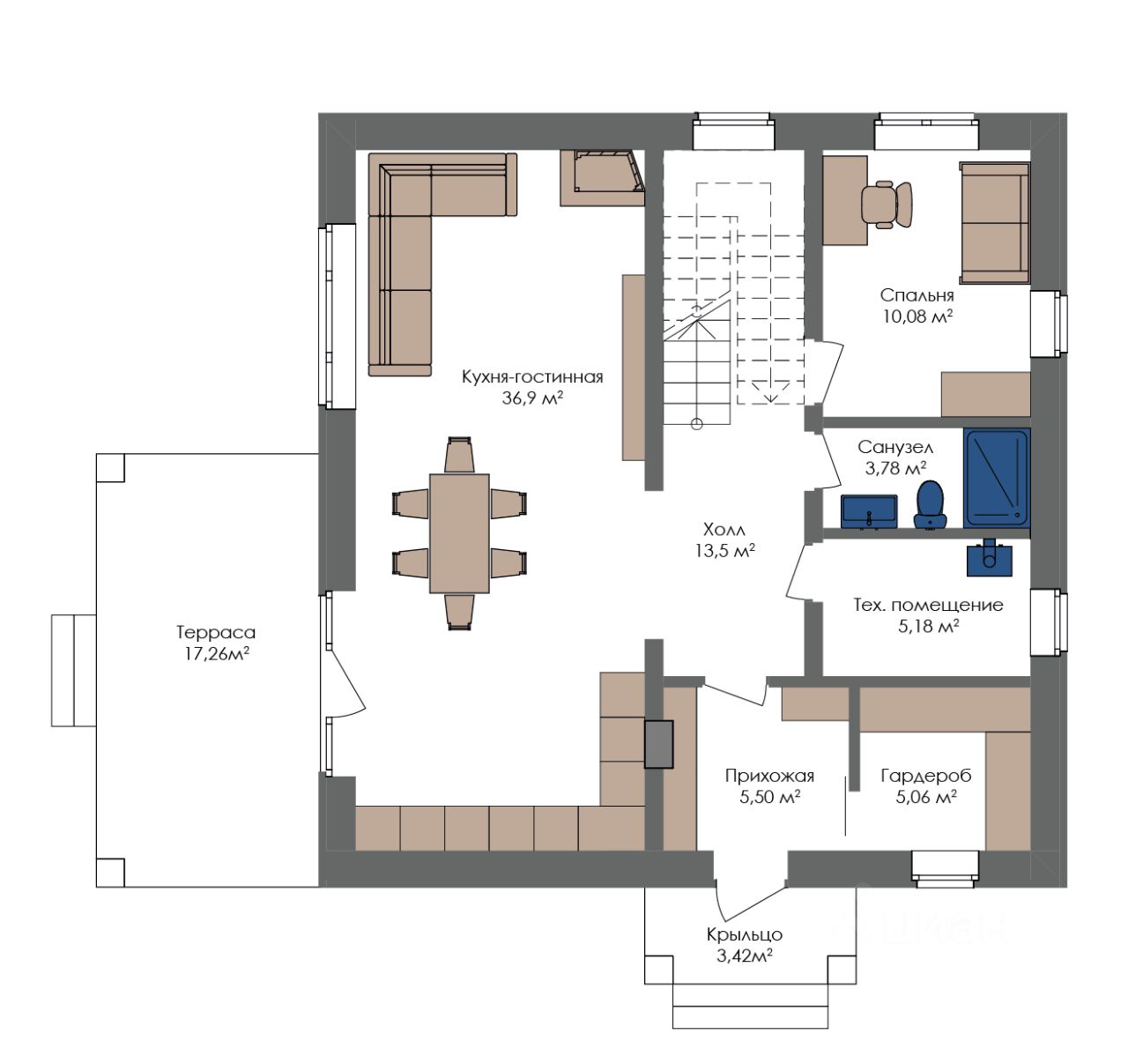 На первом этаже просторная кухня-гостиная 37 м² с выходом на террасу, гостевая спальня/кабинет, санузел, гардероб, котельная