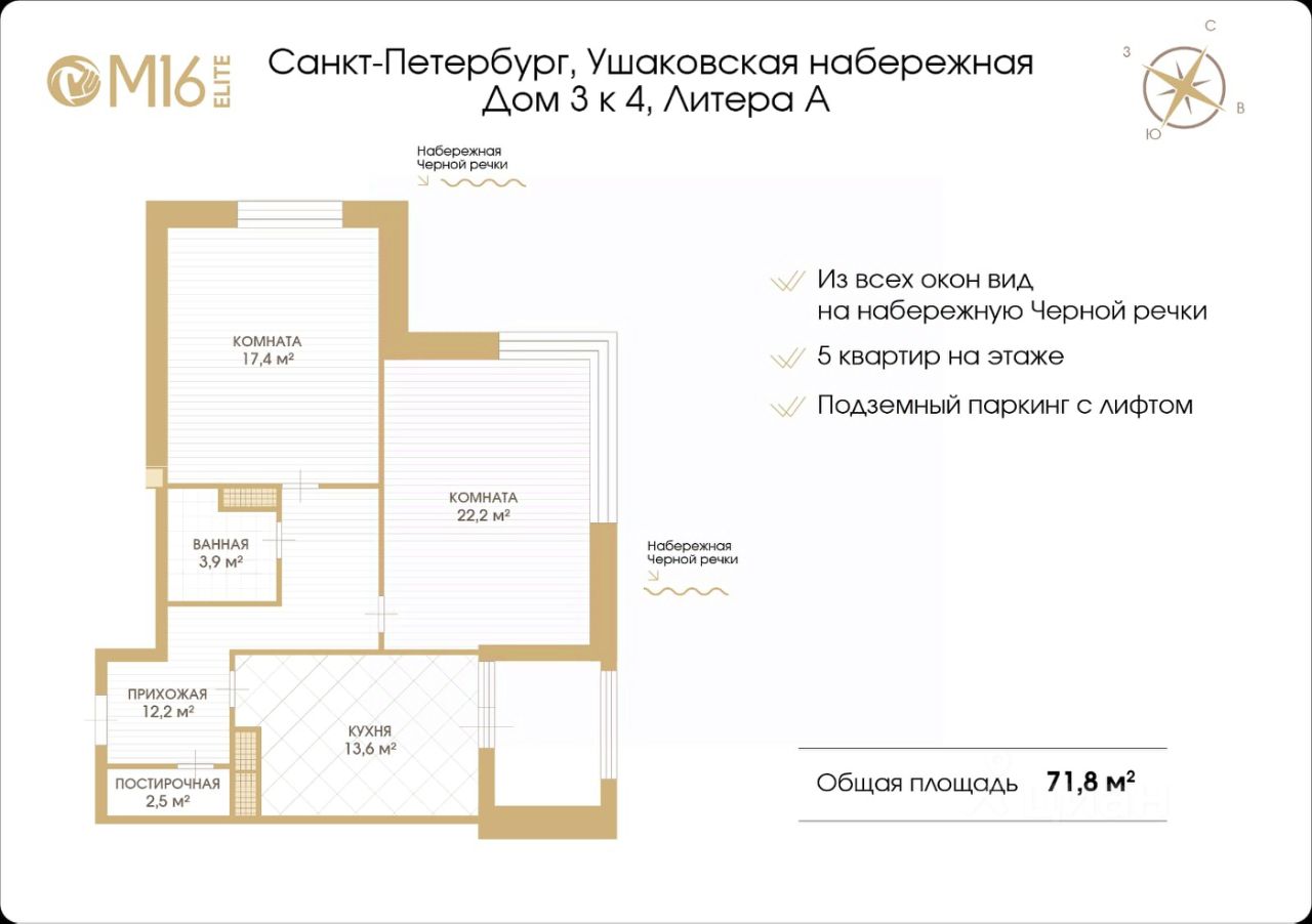 Локация: ЖК расположен в Приморском районе — одном из самых престижных районов Петербурга. Ушаковская набережная — это редкое сочетание центра города, вида на воду и тишины.