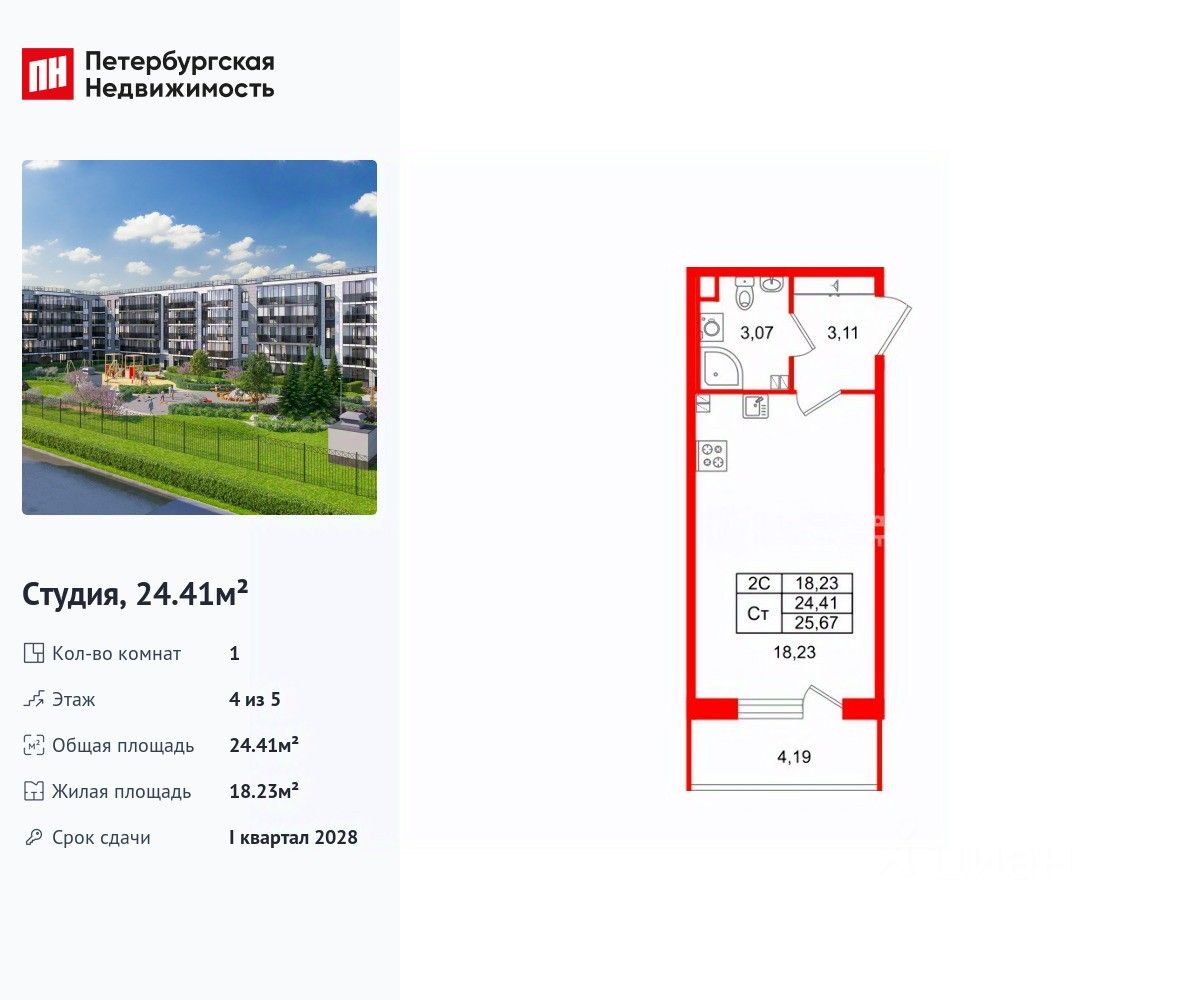 Удобная, классическая, функциональная европланировка, вместительная прихожая 3.11 м². Общая площадь студии - 24.41 м², жилая 18.23 м², высота потолка 2.77 м.