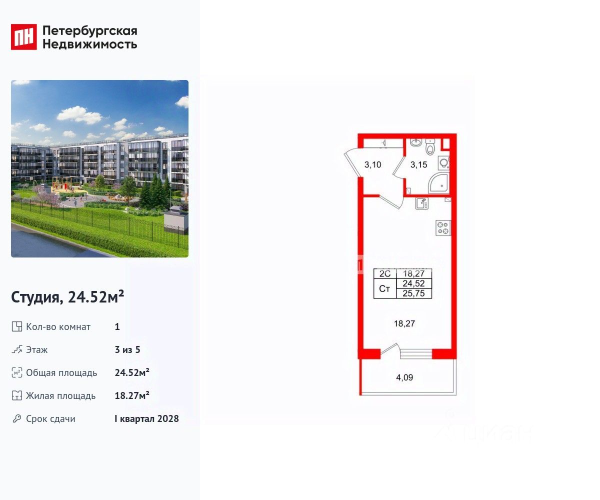 Удобная, классическая, функциональная европланировка, вместительная прихожая 3.1 м². Общая площадь студии - 24.52 м², жилая 18.27 м², высота потолка 2.77 м.